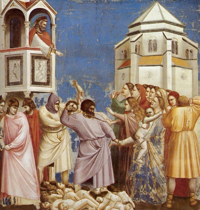 Ci dessous, l’une des oeuvres majeures de Giotto ( 13 et 14 ème siècle) : le massacre des innocents ( Chapelle Scrovegni, Padoue) ; révolution picturale dans la mesure où Giotto, introduit délibérément l’émotion et l’identification aux figures peintes..
