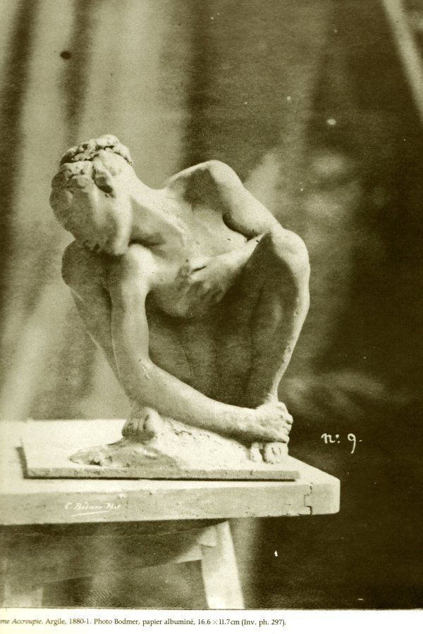 Epreuve en plâtre, dans l’atelier en 1880 de la même femme accroupie, ici plus vive que dans sa version de bronze. Lumières et matières transforment la vision. Fragilité, au bord du socle/sellette.