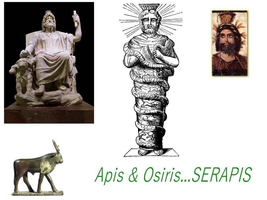 La substitution la plus incroyable, et qui sera féconde , celle de la figure inventée de Sérapis. Archétype du dieu biblique et chrétien et/ou du Zeus/Jupiter. Dans tous les cas, il y a entente pour évincer clairement les forces féminines.