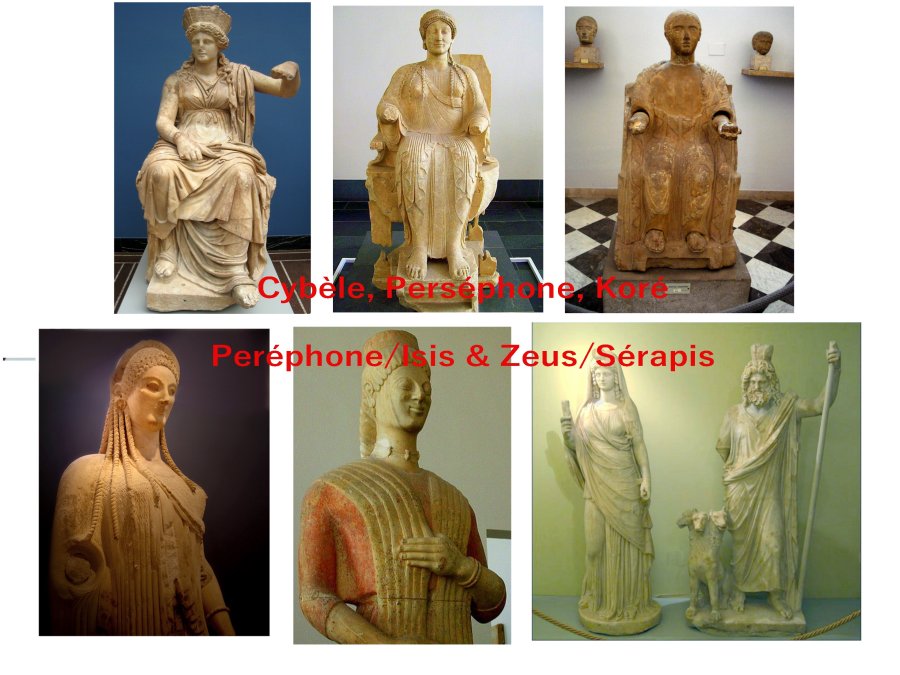 Perséphone/Proserpine, réduite à la fille de Cérès, déesse des moissons et des saisons fertiles ; elle garde une certaine importance populaire, mais perds les pouvoirs sur les fauves et les bovins.