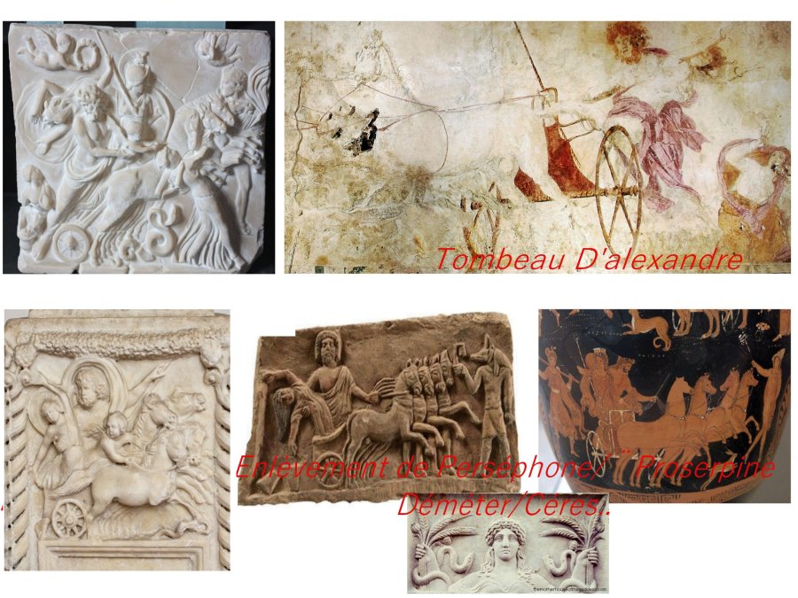 L’importance accordée, dans la culture gréco-romaine, à l’enlèvement ( viol) de Perséphone, est emblématique de l’enjeu. Déesse perpétuant les premiers mythes féminins tous puissants elle est pourtant représentée comme la proie passive et captive d’ Hadès. Fresque sur le tombeau d’ Alexandre. Les enjeux virilistes sont de taille.