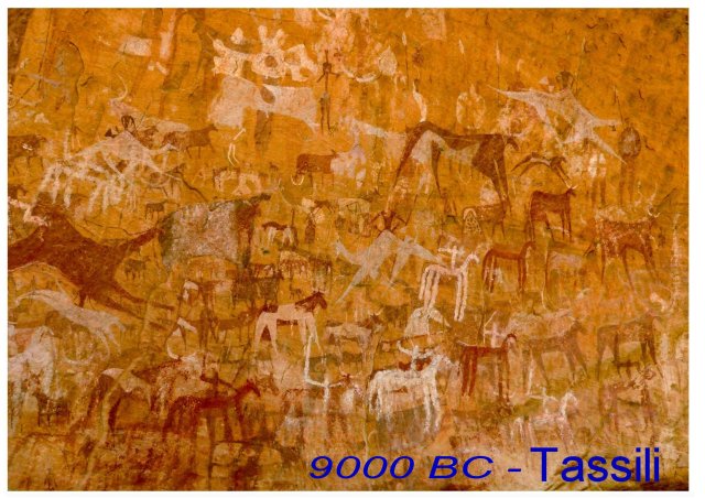 Peintures du mésolithique. Témopignages d’une vie intense ; humains et animaux en compagnie avant la désertification. La richesse artistique de ces lieux est encore à découvrir.