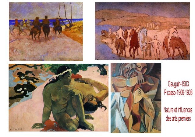 Picasso, grand manipulateur de formes, traduit en peinture, la force franche des sculptures africaines qu’il a rencontrées. Il y voit de forces premières et essentielles, liées à la nature, la terre, les corps.