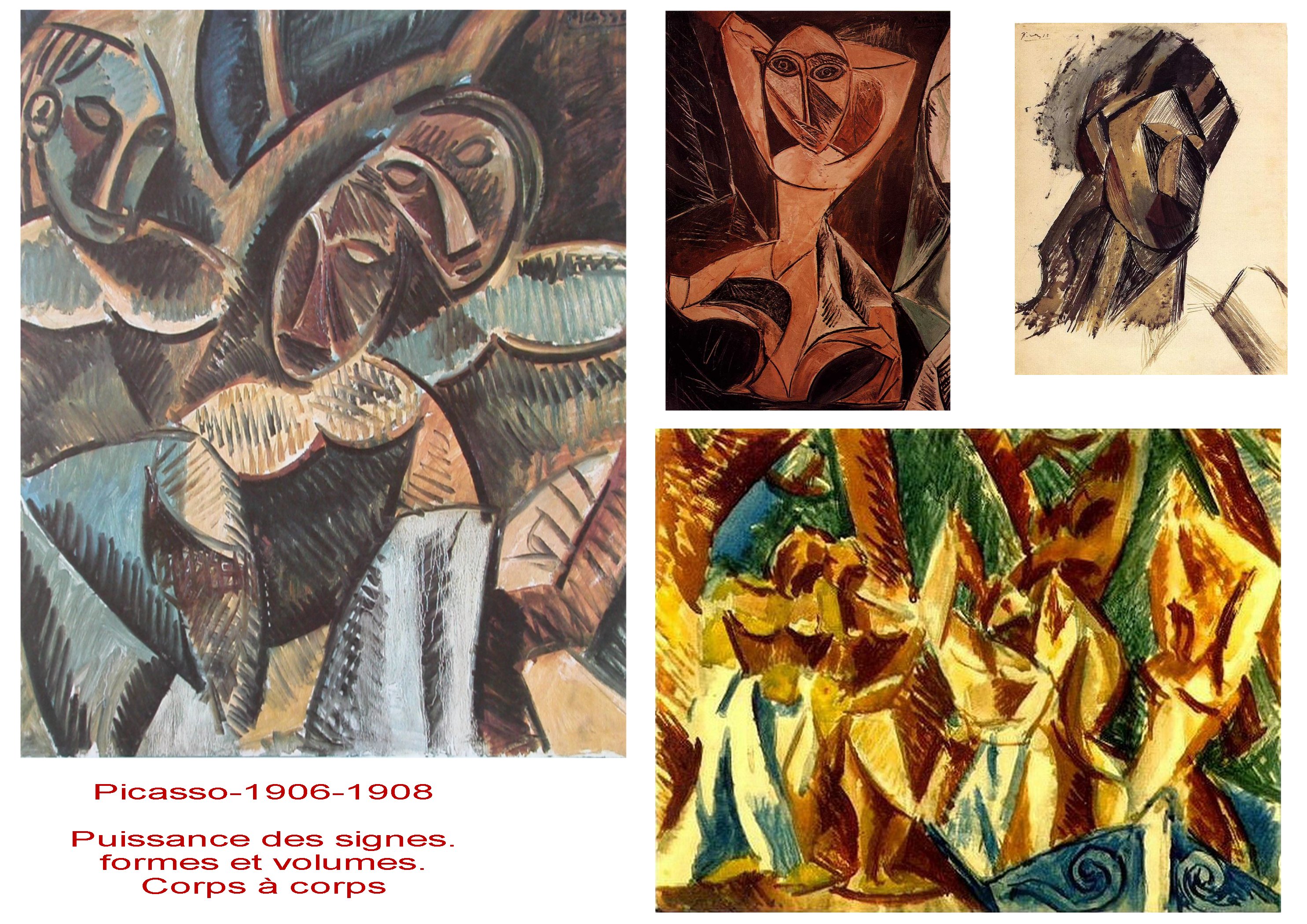 Picasso, grand manipulateur de formes, traduit en peinture, la force franche des sculptures africaines qu’il a rencontrées. Il y voit de forces premières et essentielles, liées à la nature, la terre, les corps.