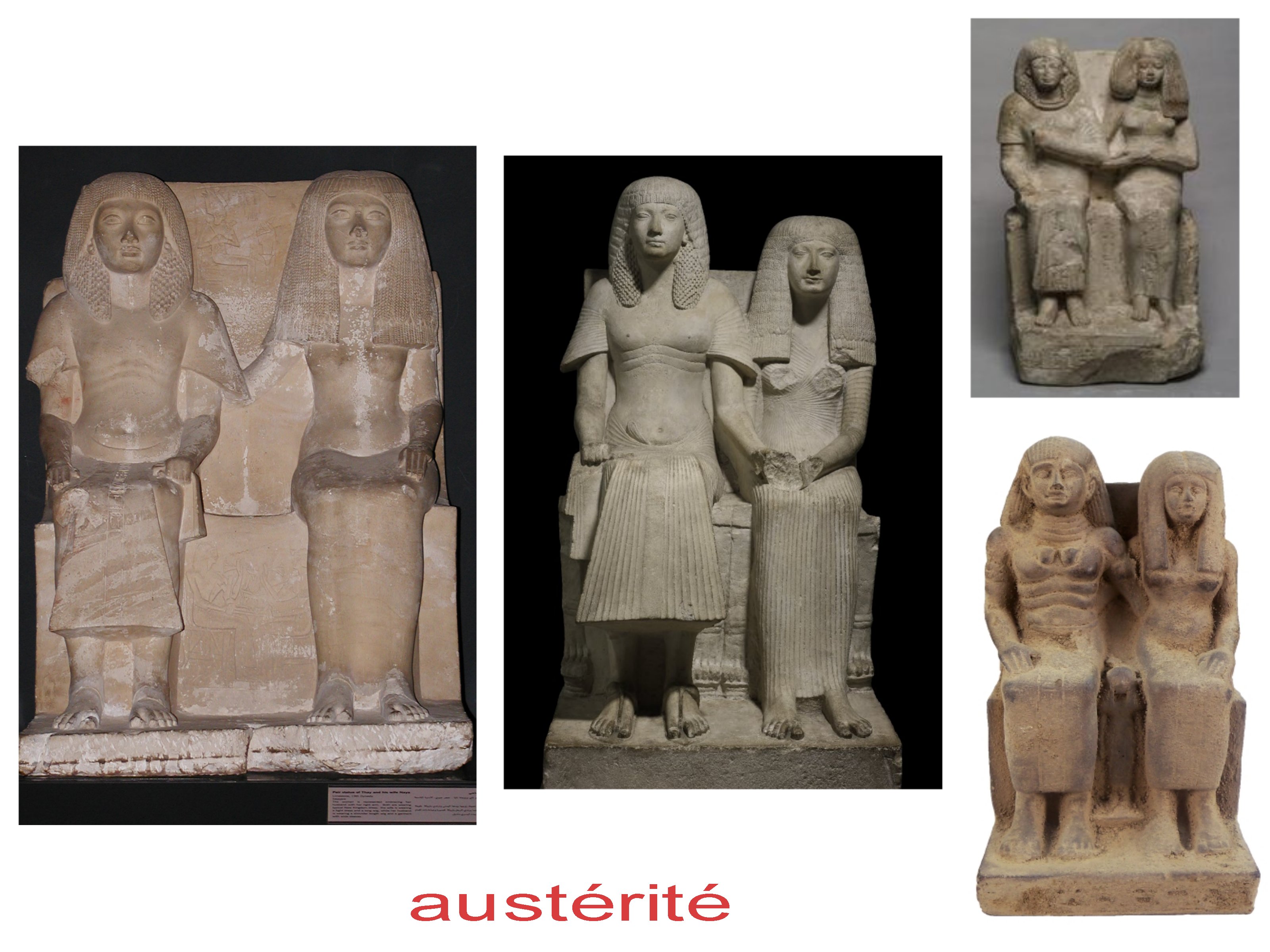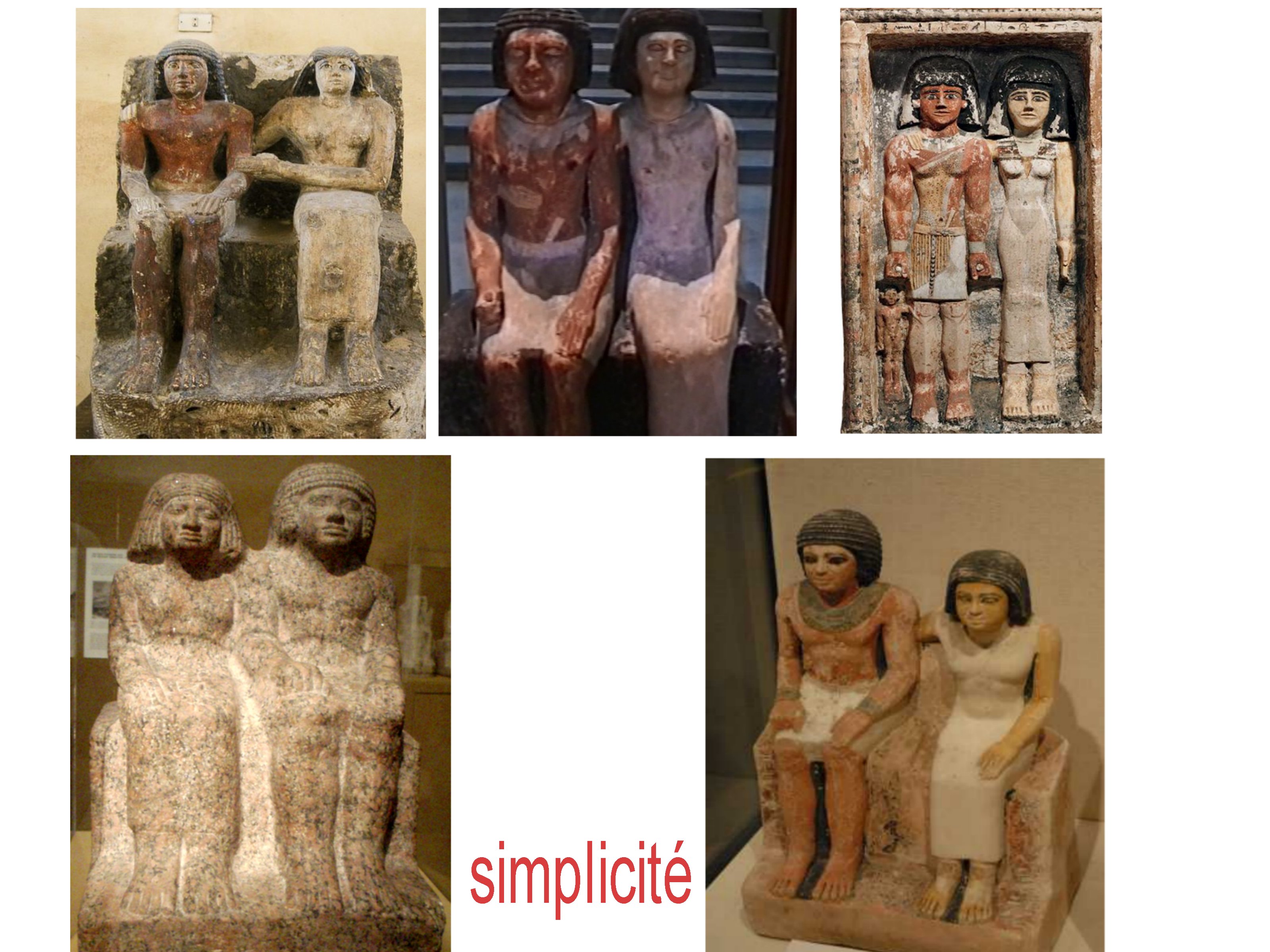 Singularités. Les exemples ci-dessous, sont de parfaits modèles de l’idée gouvernant la statuaire égyptienne de façon générale, à savoir l’extraordinaire prise en compte, grâce à un cadre unifiant, des singularités. Le « canon » égyptien n’est pas un idéal, c’est un cadre permettant d’intégrer tous les aspects, les occurrences d’un mode d’existence. Ainsi, les différences de taille, entre l’homme et la femme, ne sont pas niées, elles se combinent parfaitement et de façon émouvante avec le principe du couple équitable.