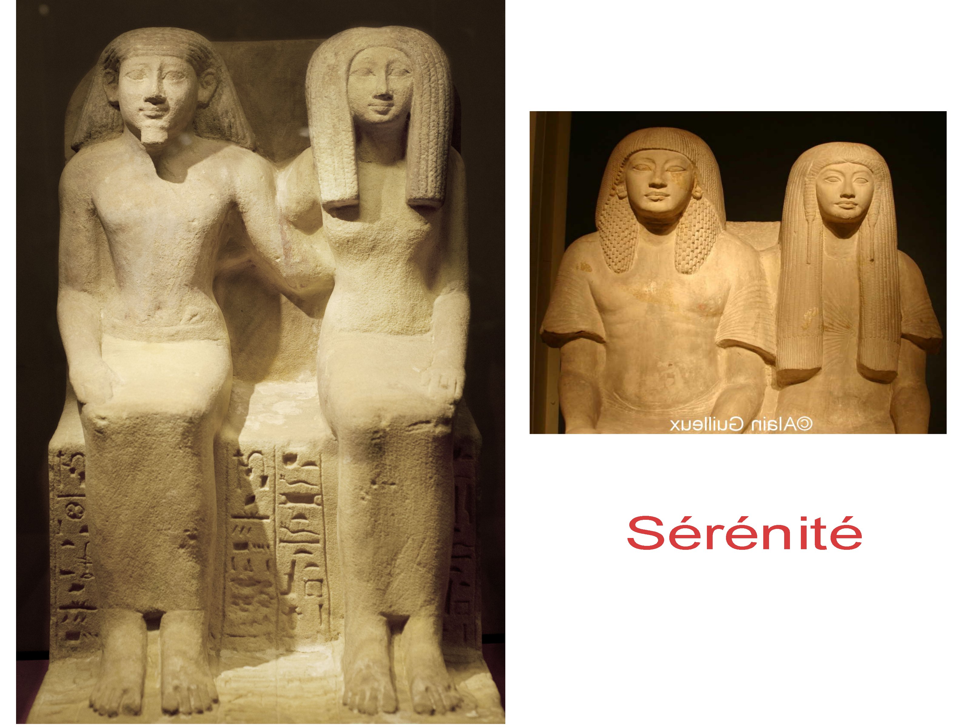 Continuité. L’une des notions fondamentales se trouve exprimée avec force et continuité dans les postures des couples. Solidaires et complices, souvent avec affection et tendresse ( position des mains et proximité), mais ce qui est le plus déterminant et qui se retrouve dans l’ensemble de la statuaire égyptienne, c’est la frontalité des figures et leur émergence depuis un socle.