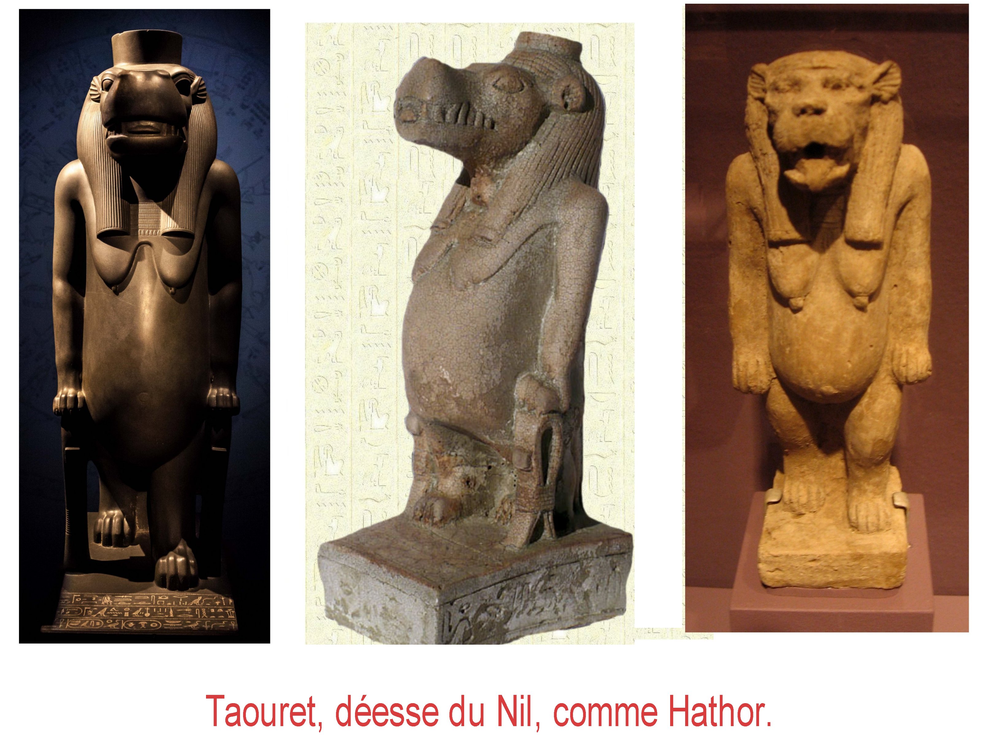 De façon étrange, on retrouve aussi une figure comme celle de Taouret, déesse hippopotame, associée au fleuve et aux mamelles remarquables ; cette silhouette peut de même être rapprochée des figures paléolithique de déesses primitives, comme transposées dans le bestiaire égyptien.
