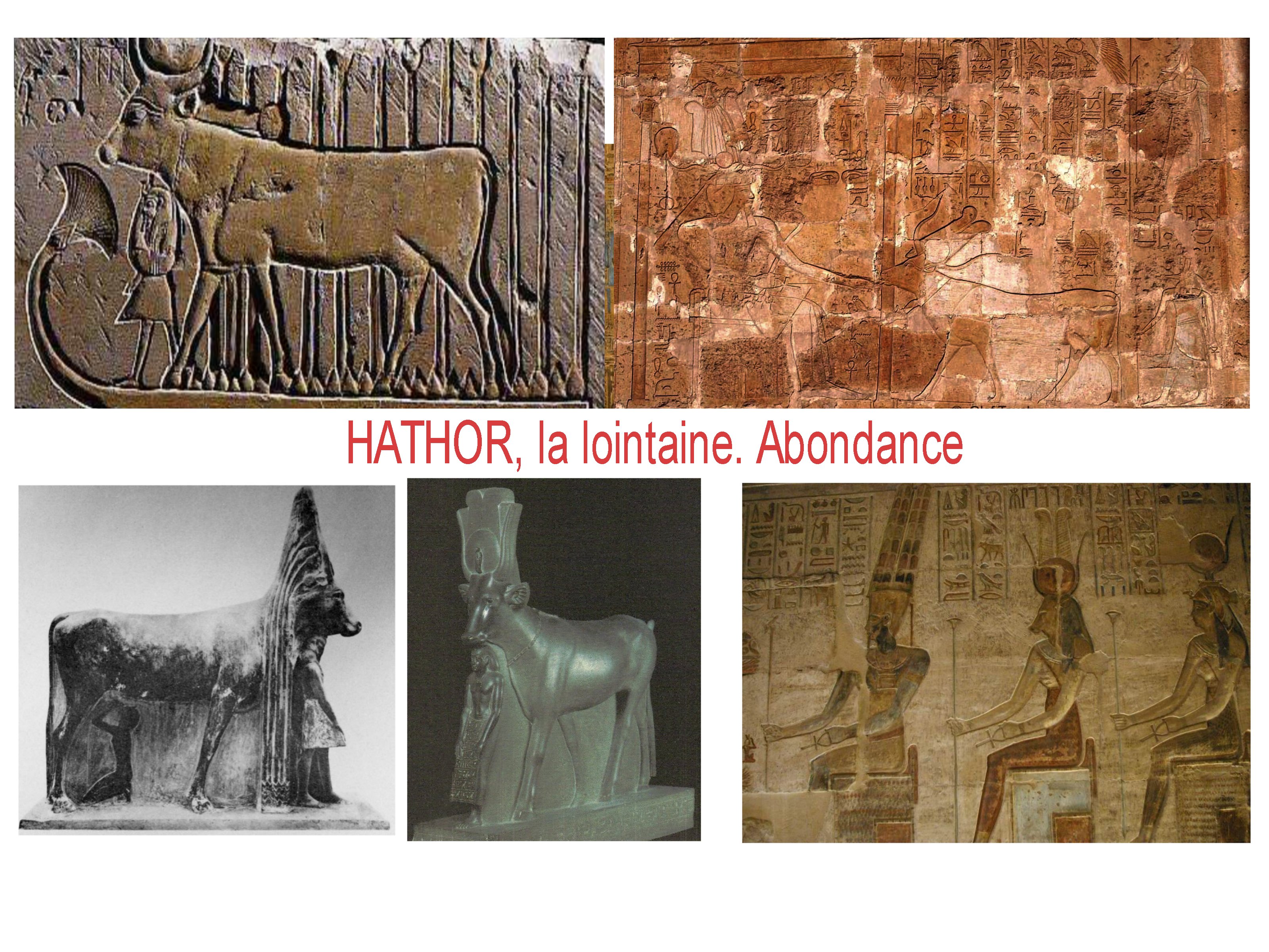 Hathor est le modèle premier et tout puissant identifié à une grande Vache ( après la grande vache du ciel). Traversant les roseaux, annonçant la crue du Nil et l’abondance, cette figure bovine semble être dans la continuité des figures et des déesses archaïques observées dans les temps mésolithiques et bovidiens. On peut sans doute rapprocher cette vénération pour les grandes vaches des peintures africaines du Tassili, de Somalie et d’Anatolie..