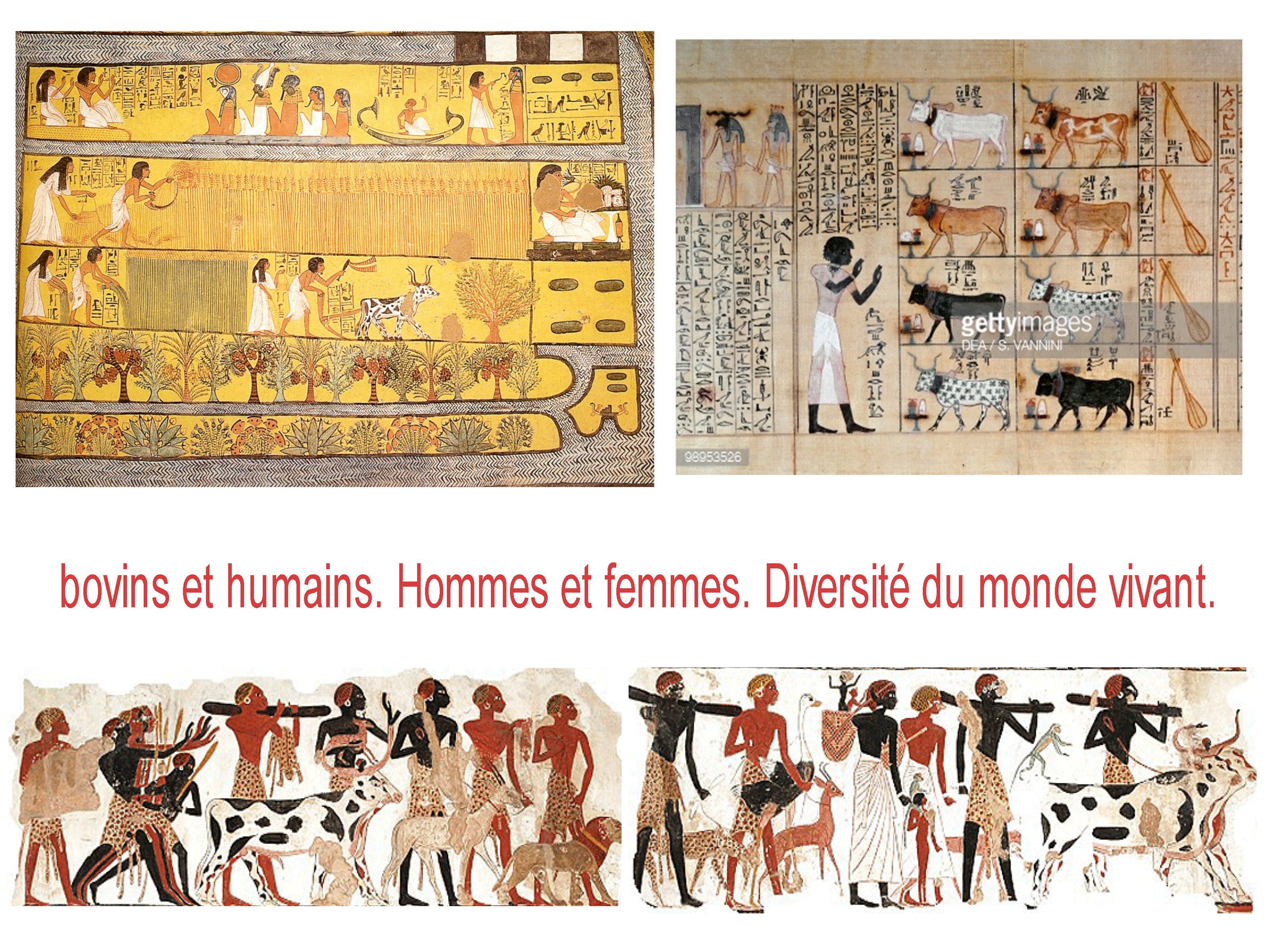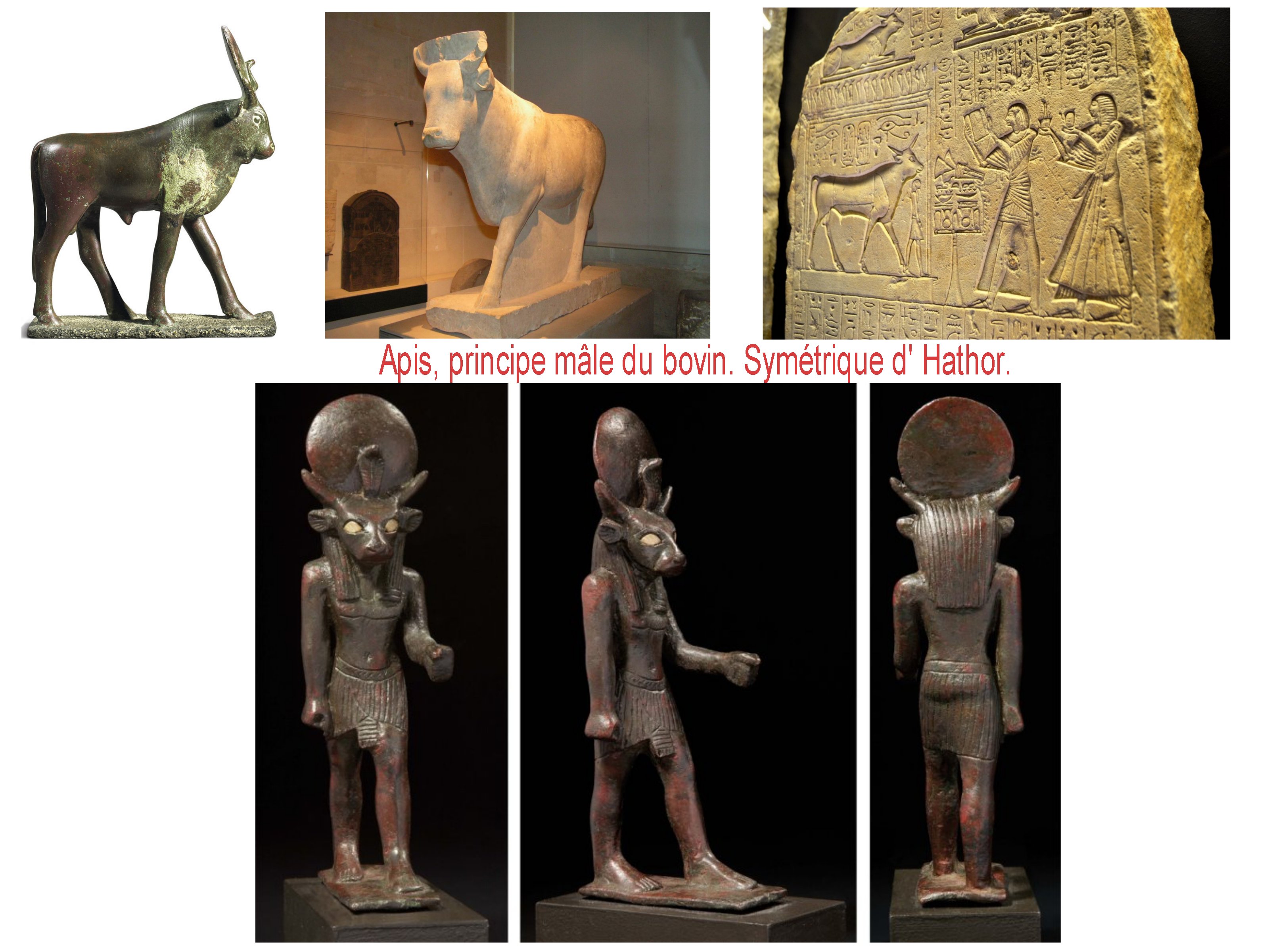 Nous avons surtout ici abordé les principes féminins, dans la continité des artciles précédents et parce que l’Egypte antique est une exception culturelle positive, mais bien entendu les figures divines masculines sont puissantes et variées ( Ra, Horus, Osiris, Apis etc..). Par exemple, Apis est comme une variante mâle d’ Hathor. Figure taurine que l’on peut sans doute rapprocher des grands taureaux et des bucranes de Catal Huyuk.