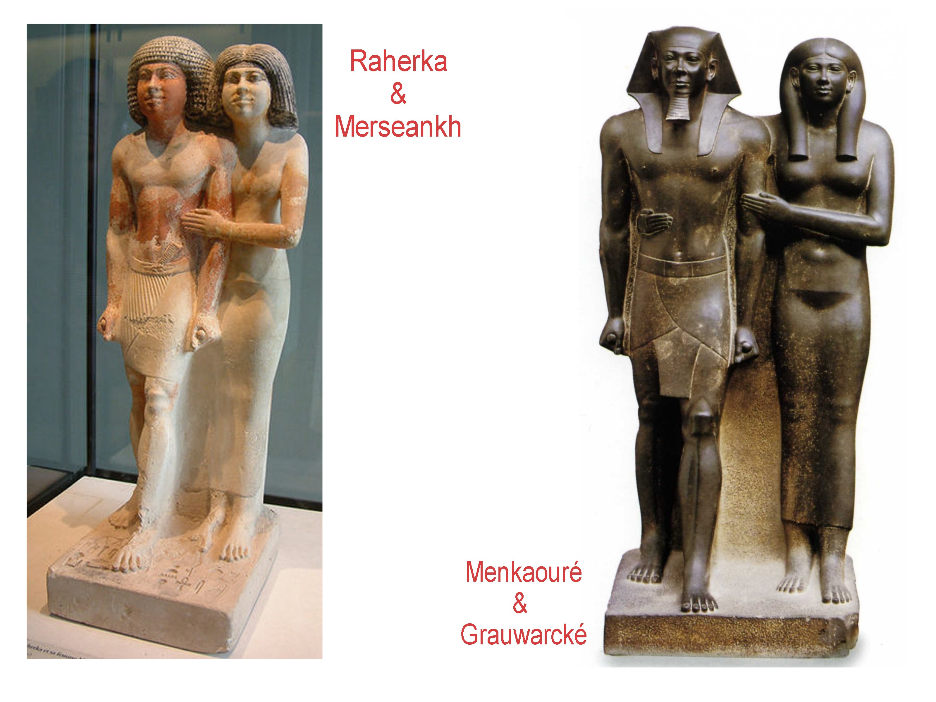 Couples de référence. Il y a continuité stricte du modèle divin/royal aux couples réels, vivants et profanes. Les couples mythiques, tels Isis/Osiris et Amon/Mout sont les modèles incarnés sur terre par les couples royaux . L’union du roi et de la reine ( parfois frères et soeurs – mais les termes ne désignent pas forcément une véritable fratrie- dans le sens où ce sont des alter-egos) est célébrée selon le même modèle de statues couples.