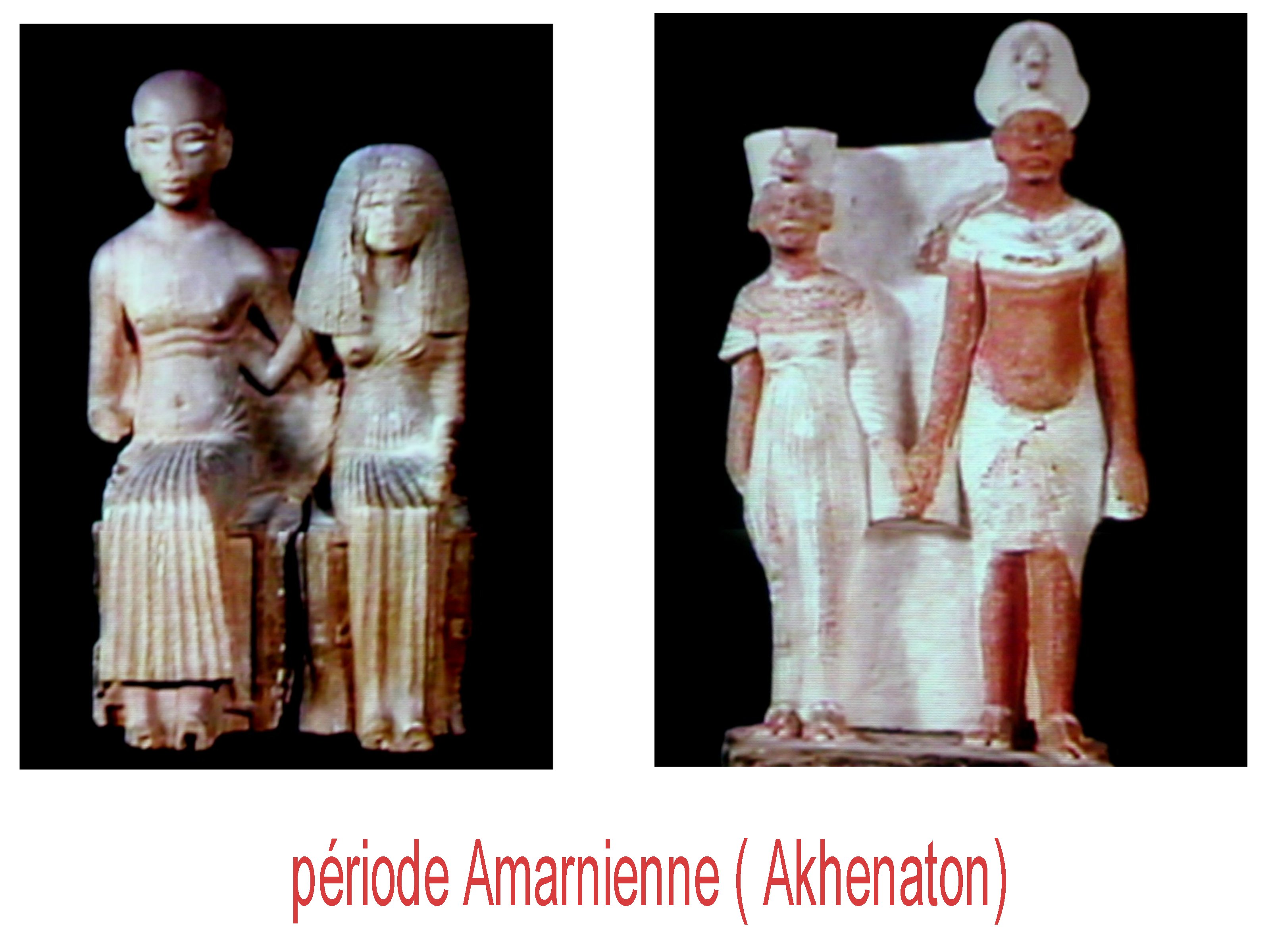 Amarna. Une preuve de la force de ce principe unifiant du masculin et du féminin est donnée pendant la période de rupture religieuse et stylistique d ‘Amenophis4 mutant en Akhenaton, mais préservant avec son épouse Nefertiti le principe complémentaire, comme on peut le voir ci dessous.