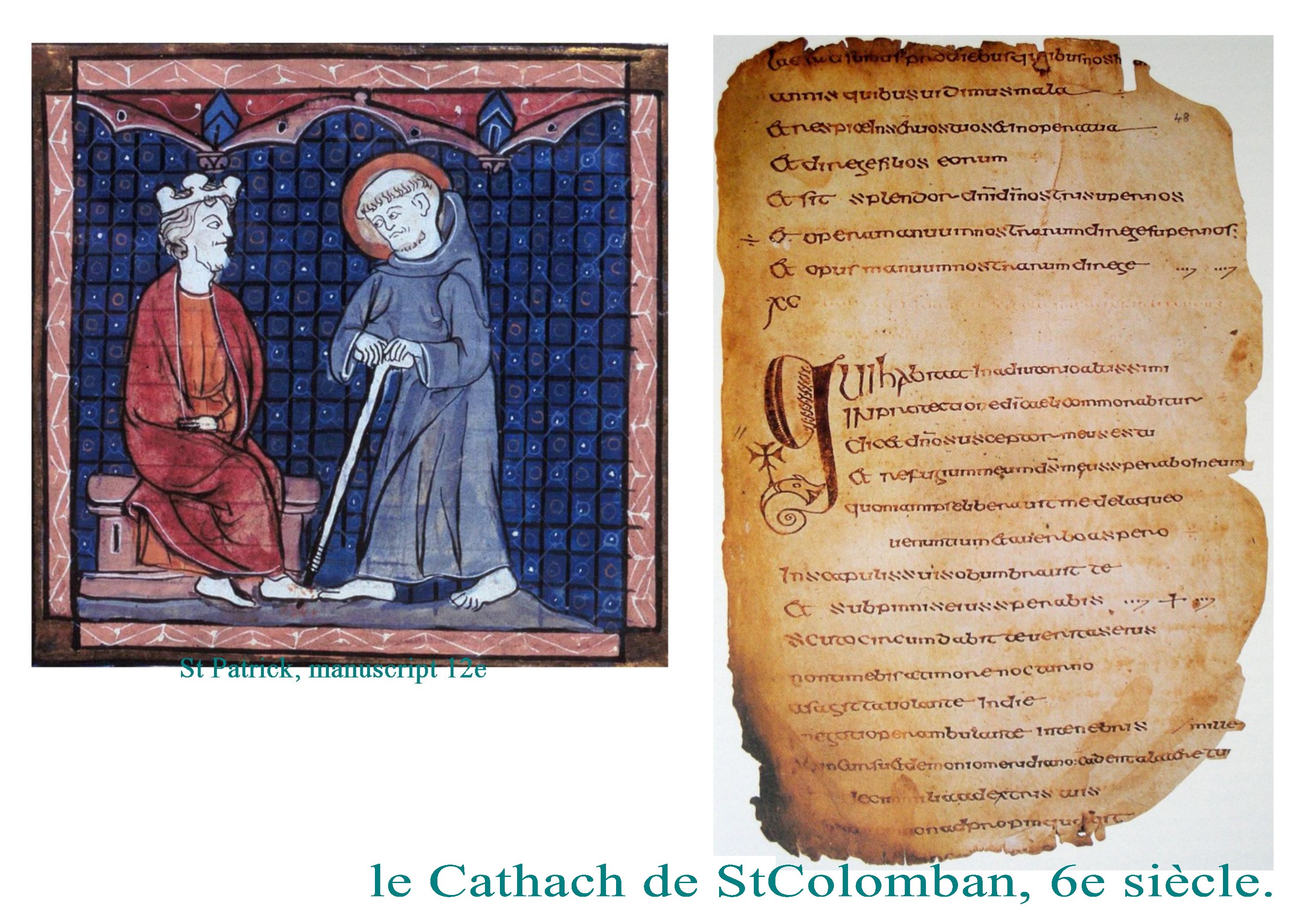 L’un des plus anciens textes manuscrits Galerie de Manuscrits médiévaux : un monde à part.semble être le Cathach de St Colomban. Avant encore de créer une oeuvre sacrée, il s’agit de préserver le texte. Ce n’est qu’un peu plus tard que viendra l’intention de glorifier et de magnifier artistiquement le texte.
