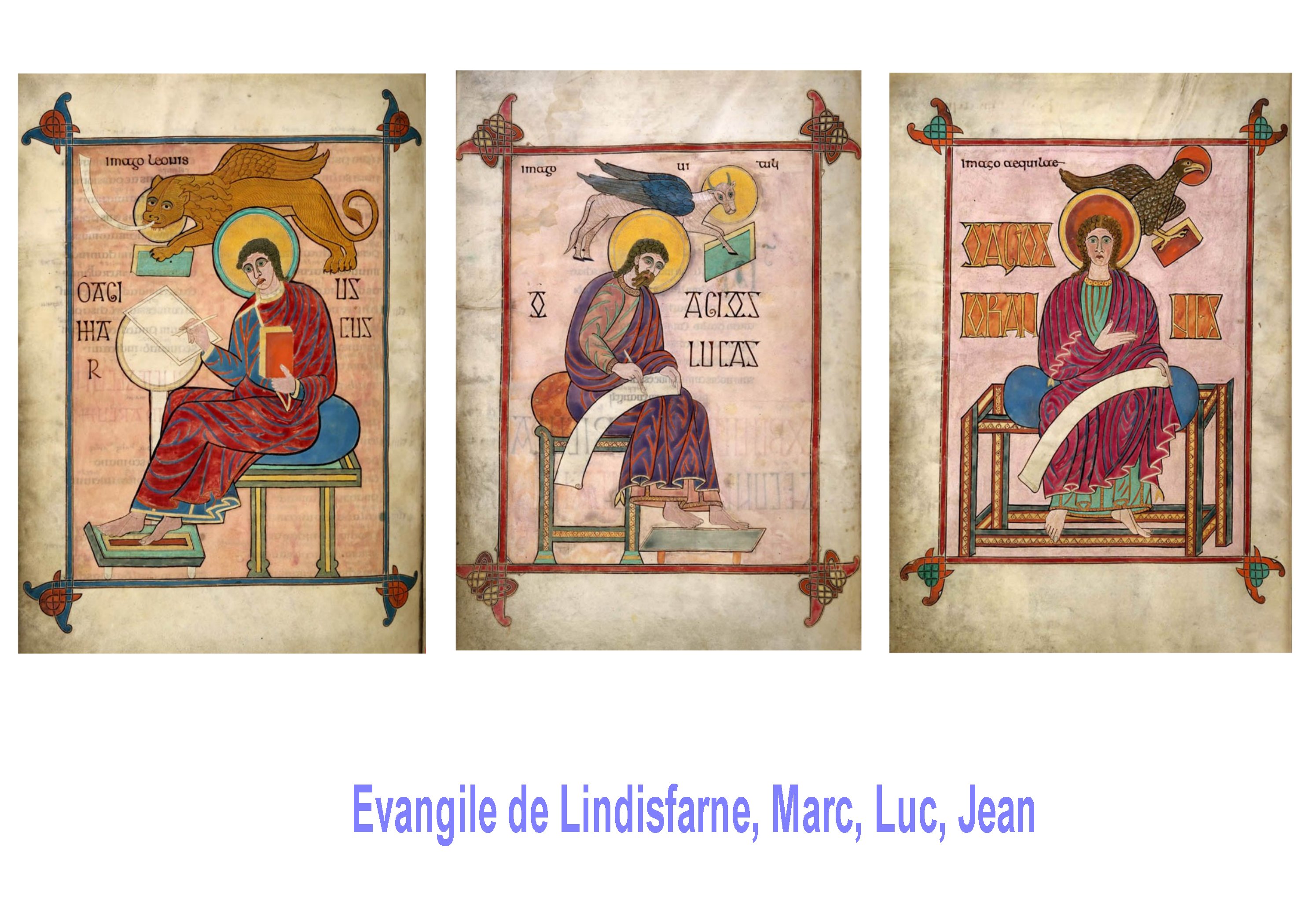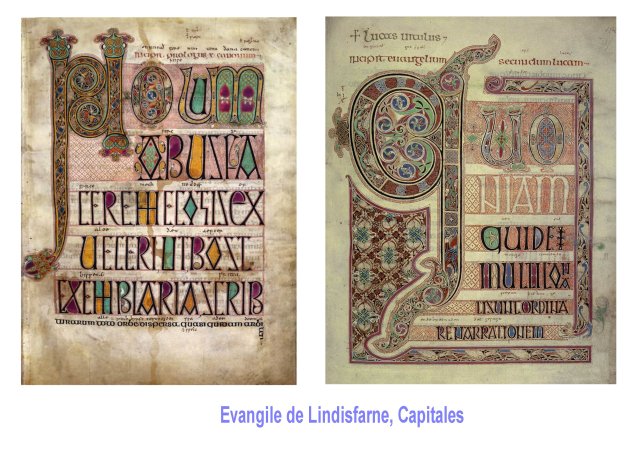 Moins connu quenle Book of Kells, l’évangile de LINDISFARNE ( côte est de l’Angleterre, à la frontière écossaise) est presque aussi remarquable ; dans un premier temps, du fait qu’il est visiblement directement inspiré par le modèle du B.o.Kells. les Majuscules et capitales sont identiques . mais ce n’est pas étonnant, les moines étaient de grands voyageurs, s’identifiant aux évangélistes, tenant du livre avant tout et de la transmission. Il se constitue clairement des réseaux, des routes, des liens de monastère à monastère. Détenir un manuscrit est aussi une sorte d’acte fondateur. De tels objets sacrés doivent sans doute fonctionner aussi comme les reliques et attirer.
