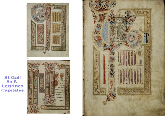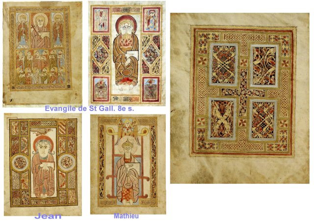 Ci dessous, l’évangile de Saint Gall, en Suisse alemanique, est le bastion le plus avancé, vers l’ouest, des moines anglo-irlandais. Le monastère est en l’honneur de St Gall, justement. Les manuscrits de St Gall, sont contemporains du B.O.Kells et ceci témoigne des circulations importantes au 8e siècle. La représentation des figures est très proche des Christs et évangélistes du B.O. Kells.