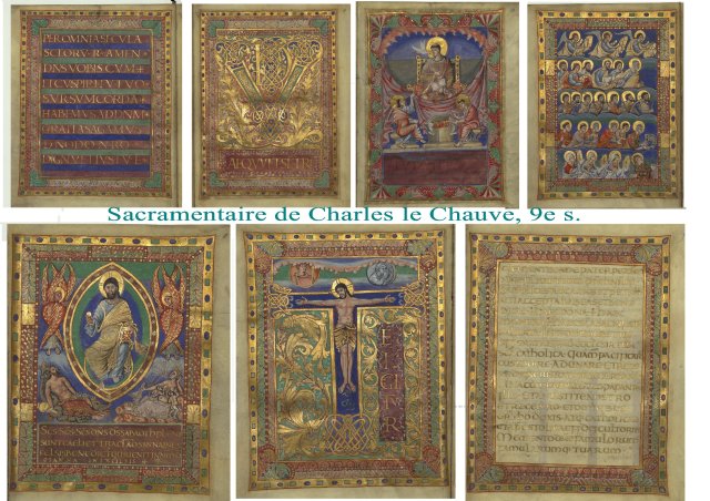 les sacramentaires ci-dessous, appartenant à Charles le Chauve sont emblématiques de cette rencontre et de la fascination concomitante pour ces 2 arts remarquables. La valeur sacrée est ici incontestablement assurée par les feuilles d’or. Ainsi, naît, dans l’empire chrétien d’occident , un art digne de rivaliser avec la grande et haute tradition Byzantine, du christianisme d’Orient. Rappelons que l’union de Charlemagne et d’Irène fut envisagée..Il y a bien un grand enjeu.