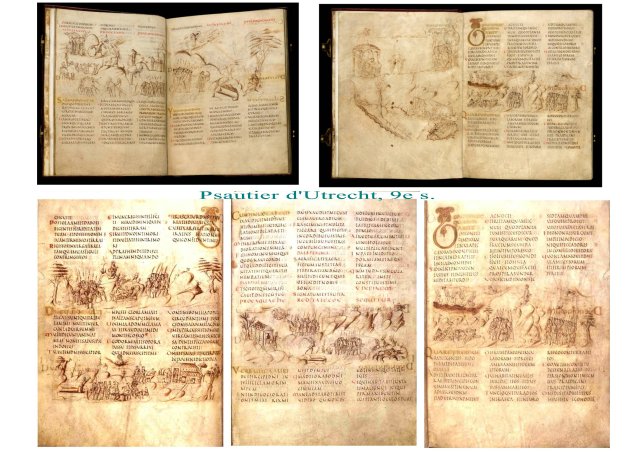 Le spectaculaire Psautier d’ Utrecht est un cas à part ; une virtuosité et une invention graphique incroyable, une précision anatomique et dynamique, comme un sens intuitif de l’espace tridimensionnel. l’ensemble, à la plume, sans or, sans couleurs, sans entrelacs. vertiges et prouesses du dessin pur. Ce style reste unique, non transposable en panneaux peints, ni en vitraux, ni en sculptures. Pas de valeur d’objet ( or, couleur, technique) seule valeur ajoutée, la virtuosité et l’invention.