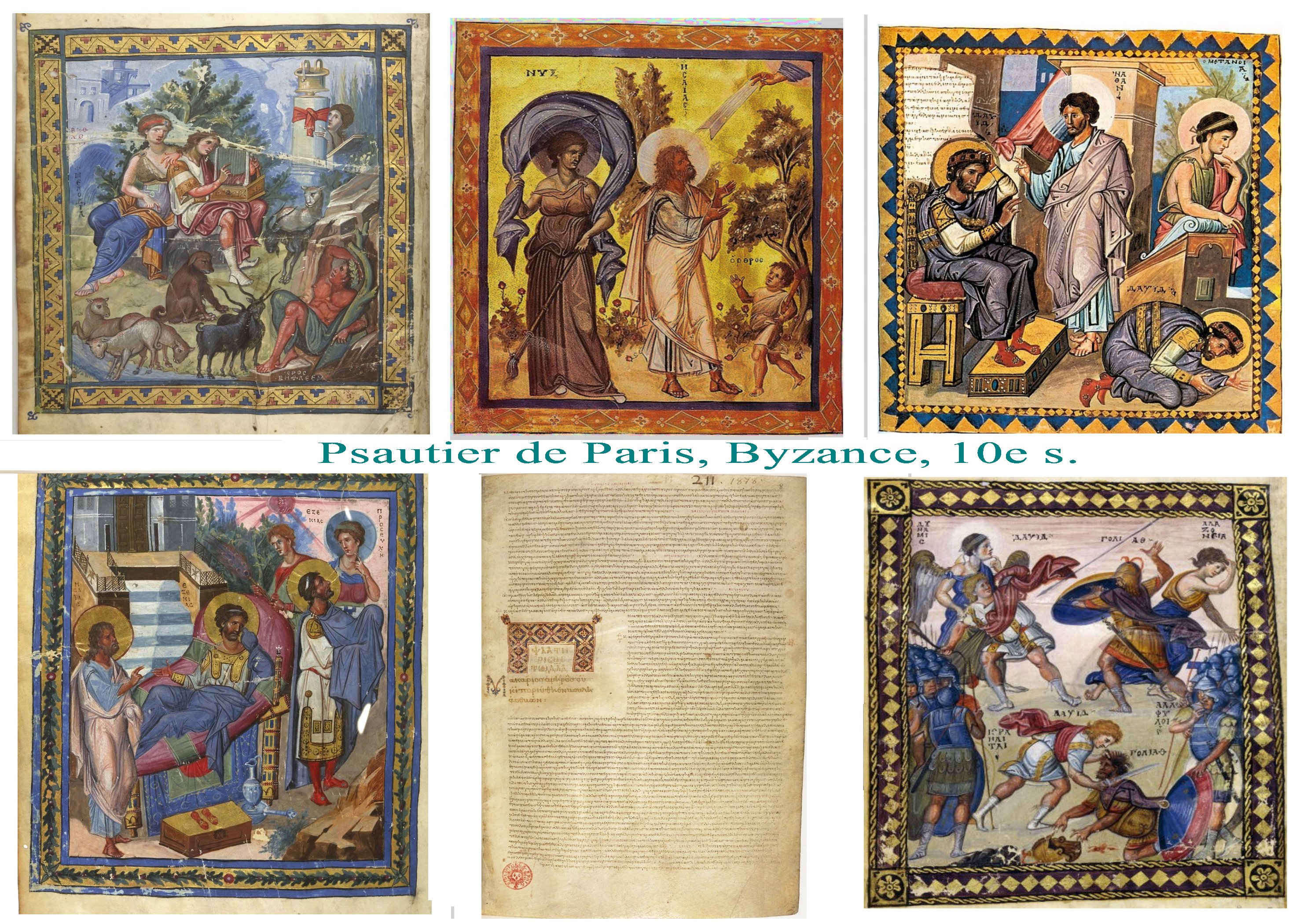 Ci dessous, d’autres témoignages de la diversité stylistique de cette période . Le psautier dit « de Paris » est très clairement dans la continuité des mosaïques romaines grecques et anatoliennes.  La petite diffusion des textes est aussi garante de l’expression de goûts privés et de courants originaux. l’homogénéisation des expressions religieuse, avec l’art Roman, va nettement affaiblir cette diversité, au bénéfice de la monumentalité.