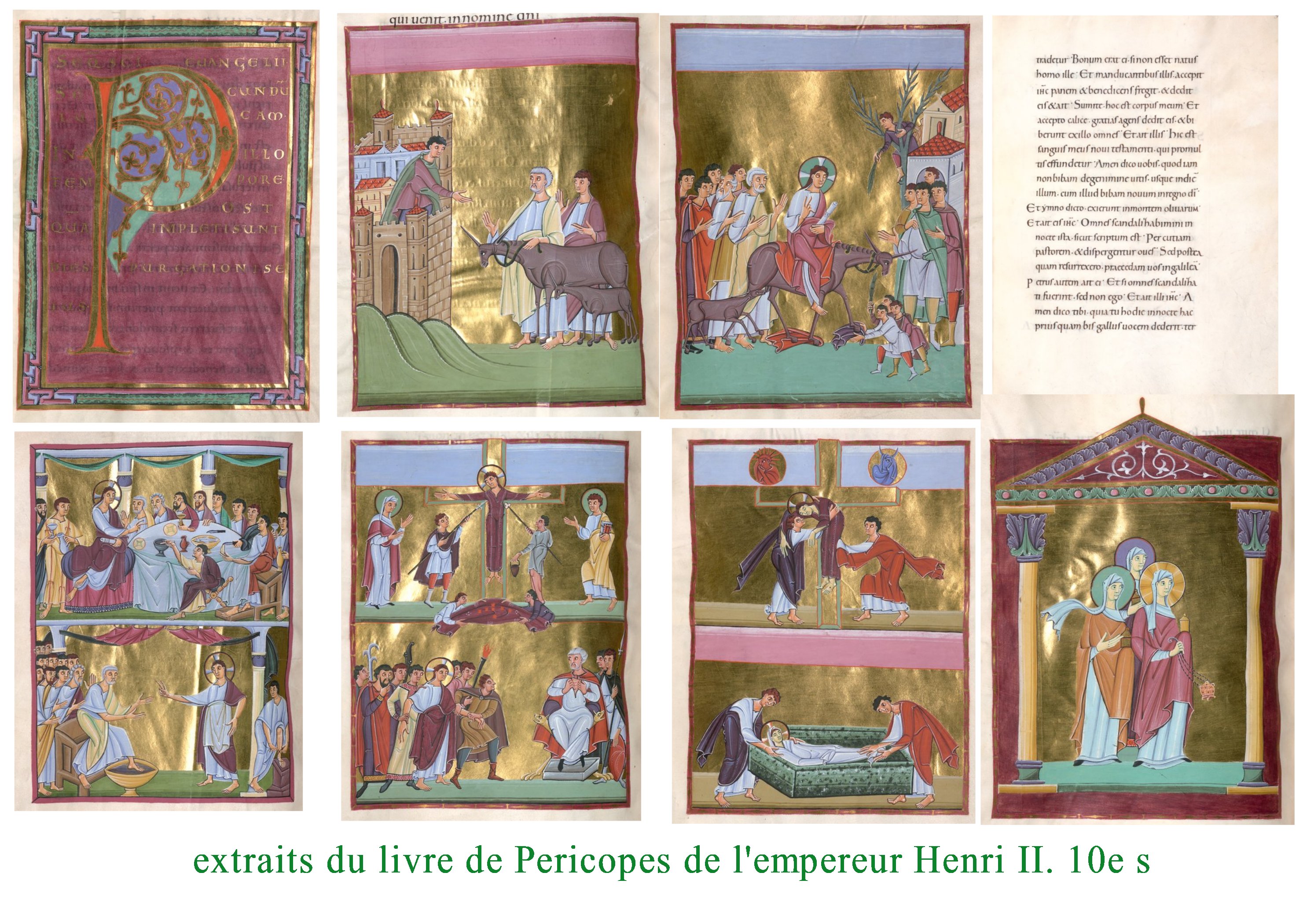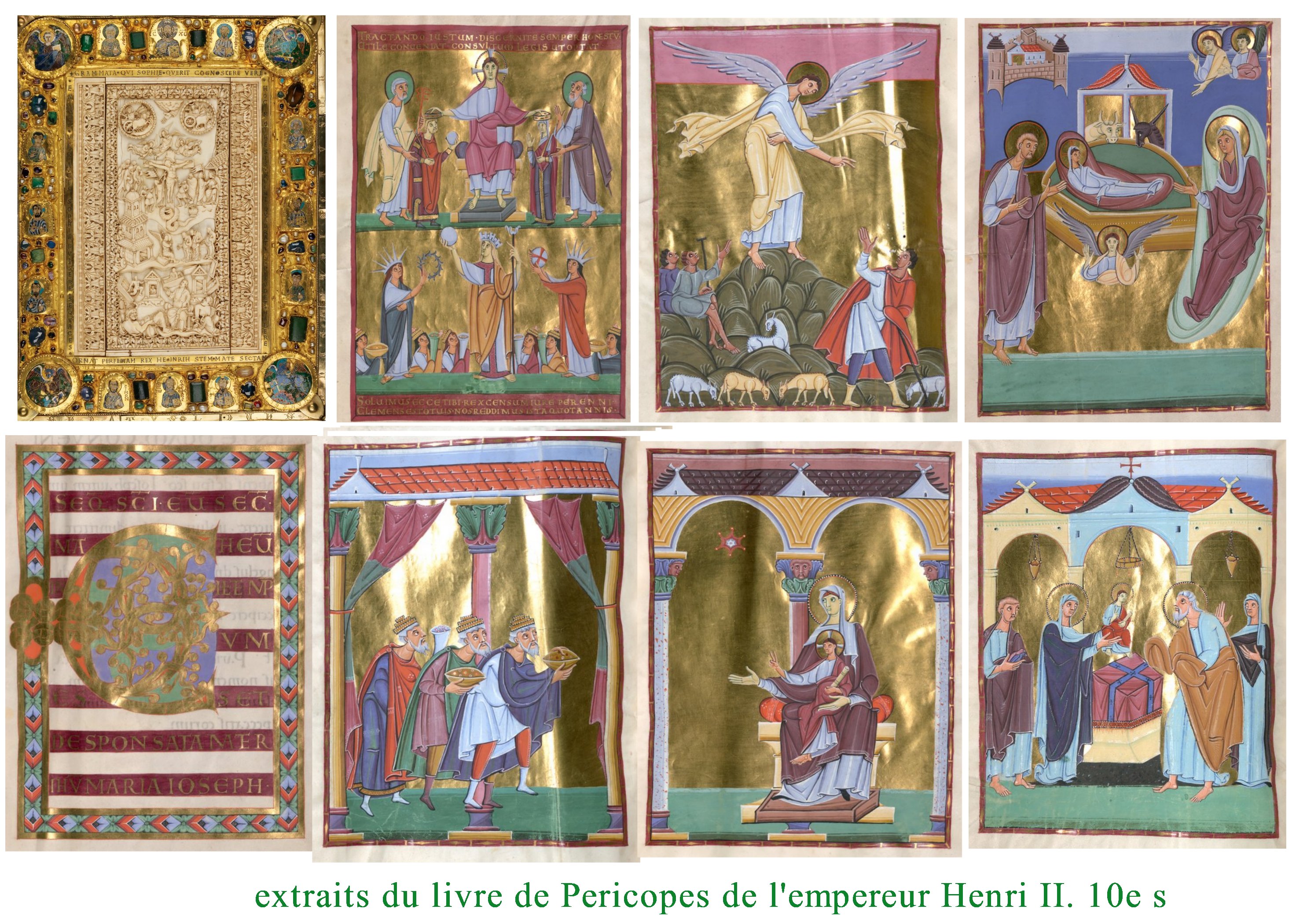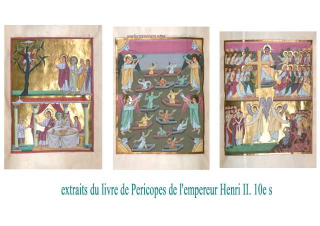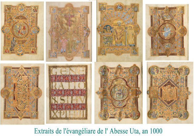Le même effet de « balancier » se retrouve dans les exemples suivants, tantôt quasiment abstraits, géométriques, dorés et mystiques, tantôt ( comme les Péricopes d’ Henri II) colorés et naturalistes,vivants et mimétiques. remarquons, que comme Charles le Chauve, Henri II peut apprécier des manuscrits de styles quasiment opposés. Loin des stéréotypes et d’un sectarisme artistique, on aurait ici comme une preuve d’un goût ouvert pour la beauté et la cohérence, plutôt que l’expression de rigidités dogmatiques.