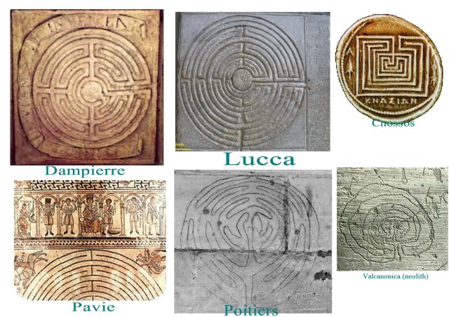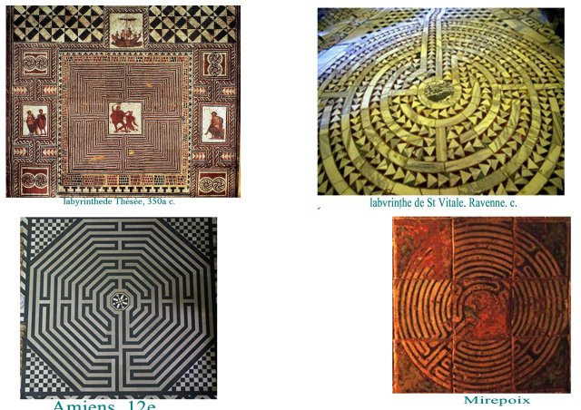 Ci dessous, un choix de labyrinthes profanes et sacrés. le plus ancien connu étant celui du Minotaure, construit par Dédale, mais cette figure se retrouve dans de nombreuses églises chrétiennes. L’idée est assez proche de l’entrelacs, à savoir, pouvoir se perdre dans un espace fini. C’est en fait une question théologique essentielle, que le monde soit parfait, car créé par Dieu, donc achevé et fini, non vide et pourtant incompréhensible, insaisissable dans sa totalité par l’entendement humain. Une forme qui résiste à la saisie (gestallt) dont la densité serait maximale. Il faudra presque attendre le 17e siècle et l’idée que l’espace est ouvert, infini, pour que le paradoxe de la densité soit dépassé.