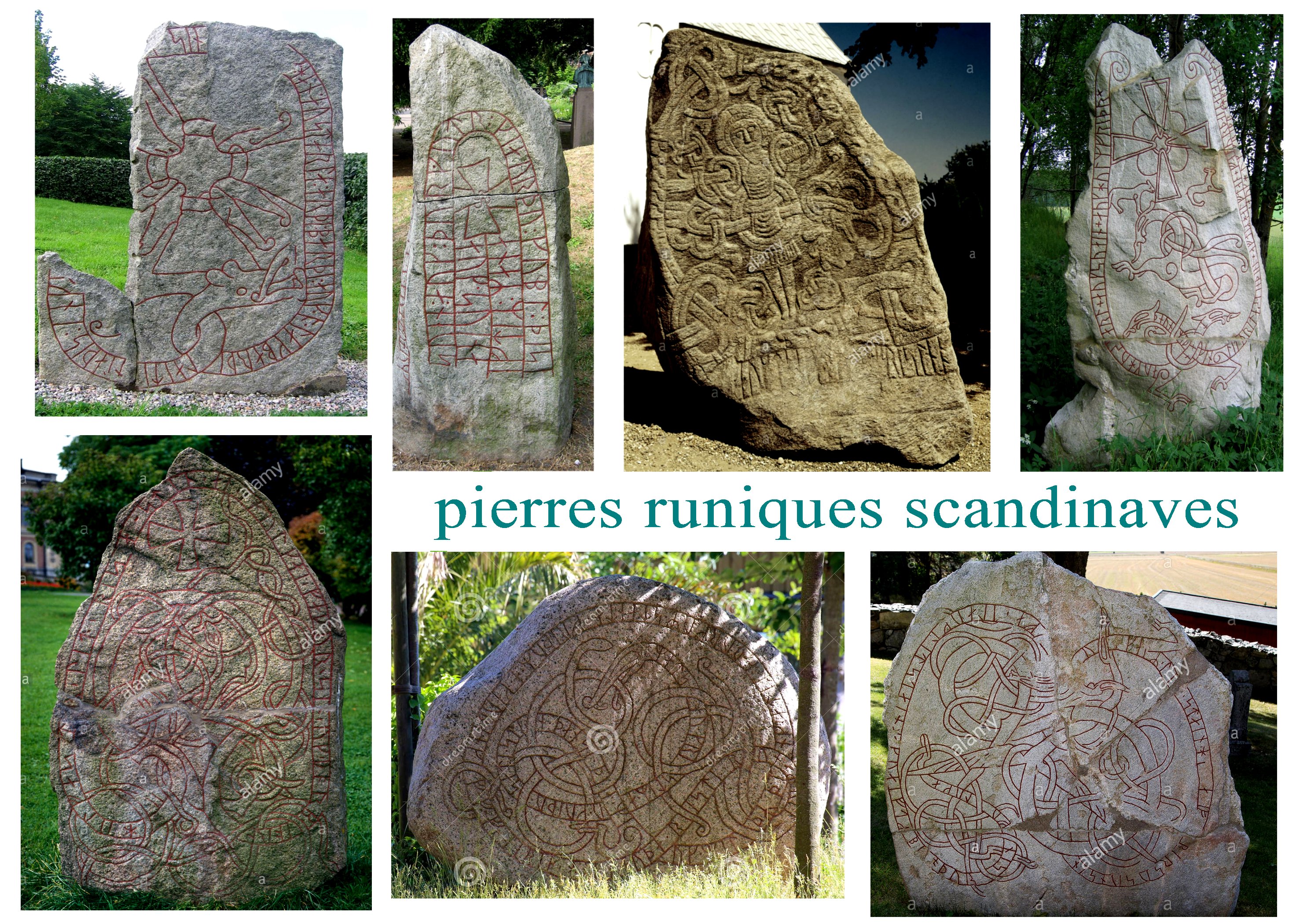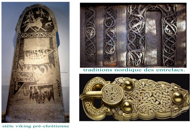L’origine nordique des entrelacs se retrouve aussi dans les pierres runiques scandinaves. Héritage très nets de peuples voyageurs, portant avec eux, sous forme de broderie et de joailleries, des objets denses car complexes et riches quoique petits.