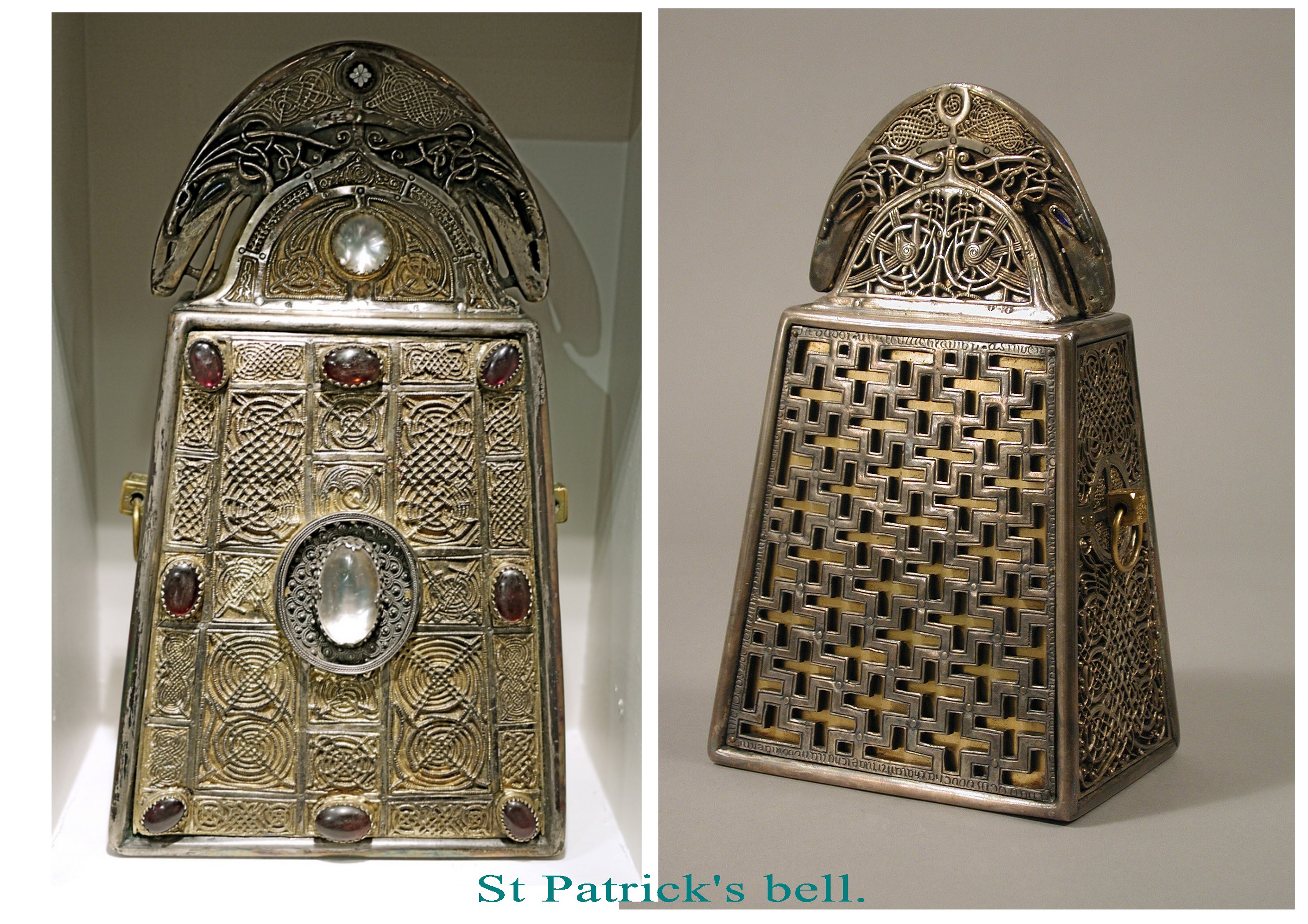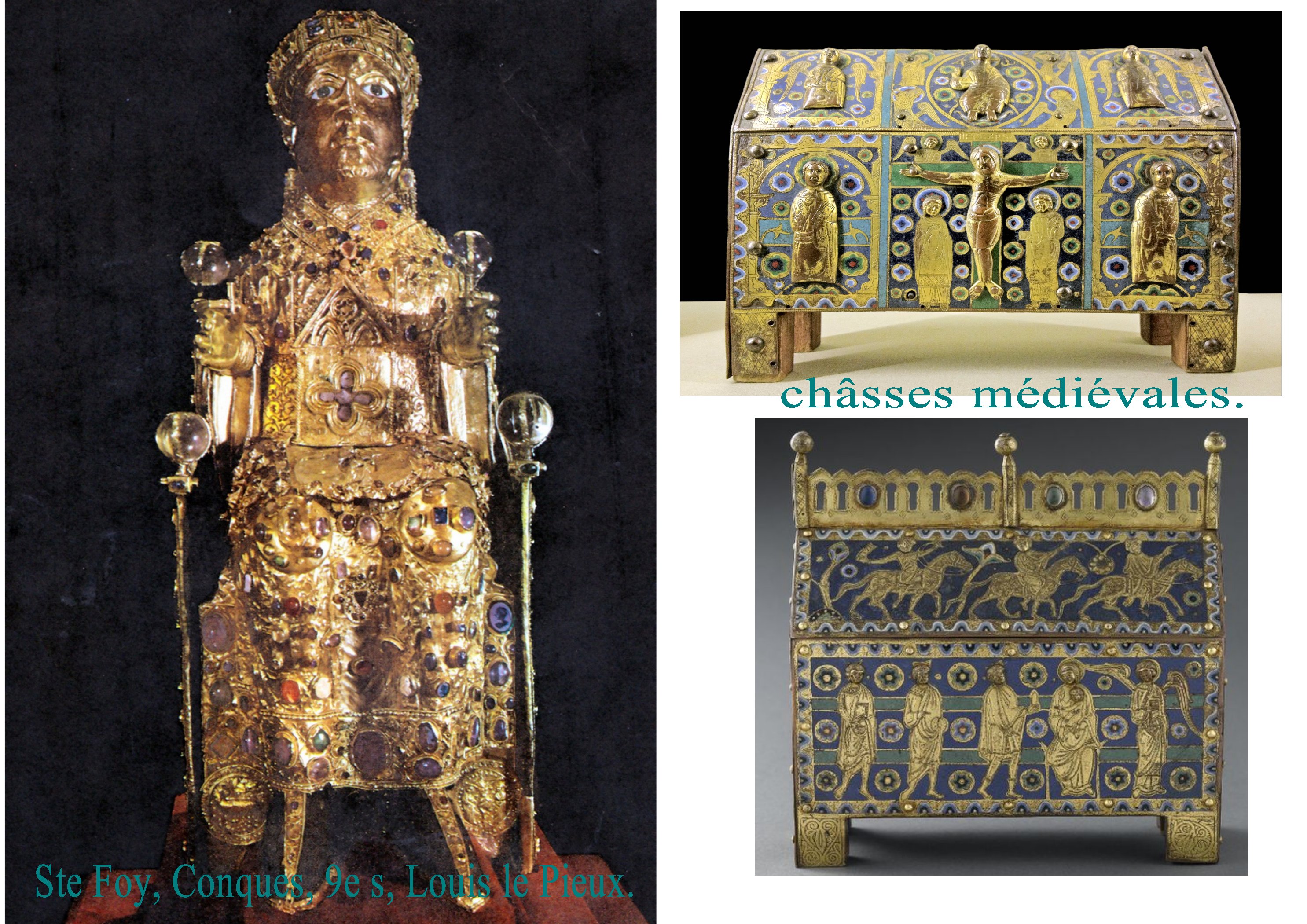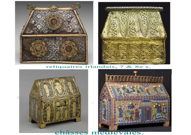 Les châsses et reliquaires participent du même esprit, à savoir concentrer sur des objets petits et non architecturaux, la densité sacrée maximale. Ors et  bijoux croisent les formes des entrelacs et des rinceaux. Il s’agit bien de préserver des objets de double nature, à la fois corps et fragments matériels et en même temps potentiel sacré et divin, magique et thaumaturge.