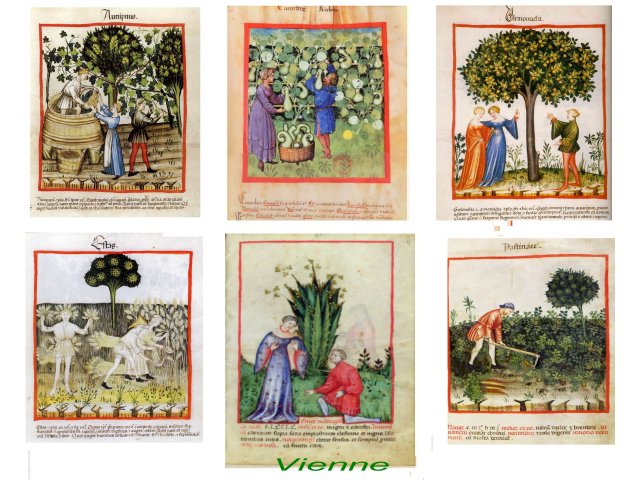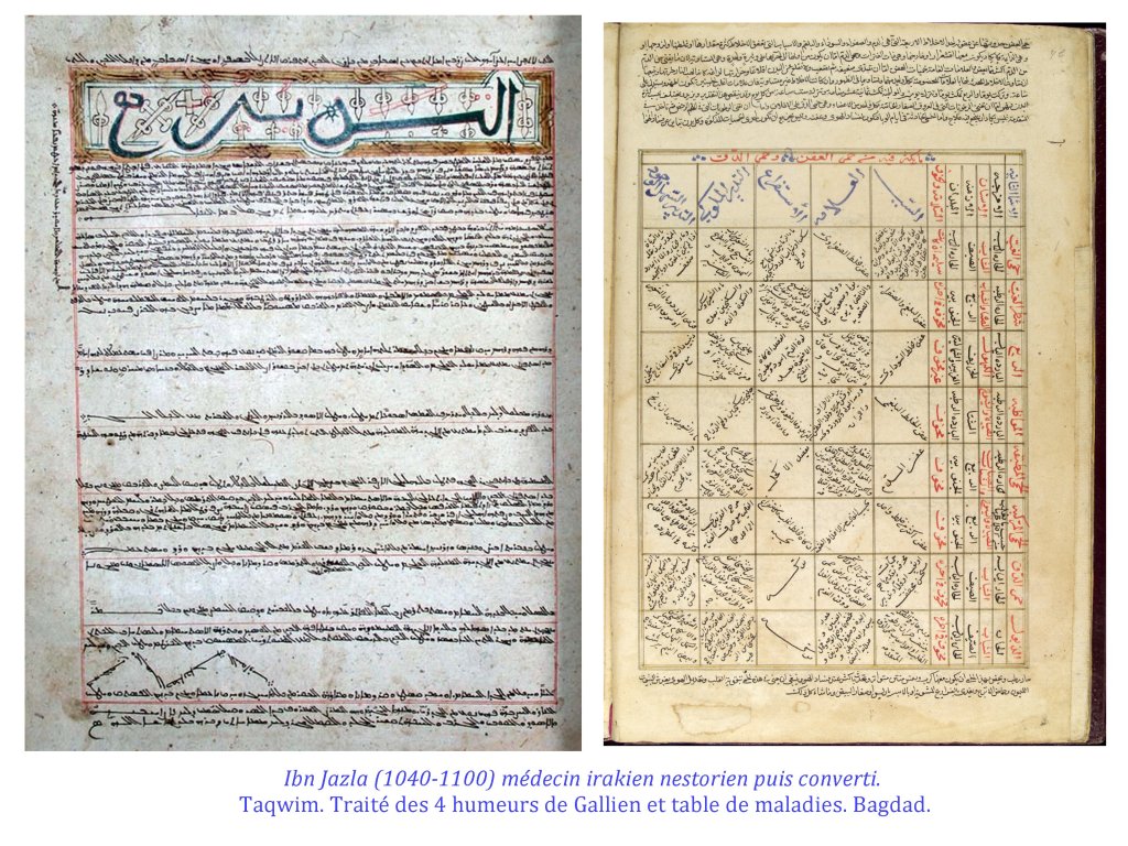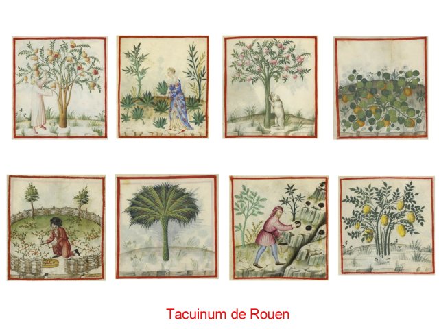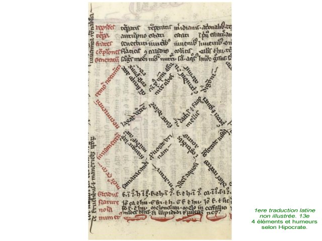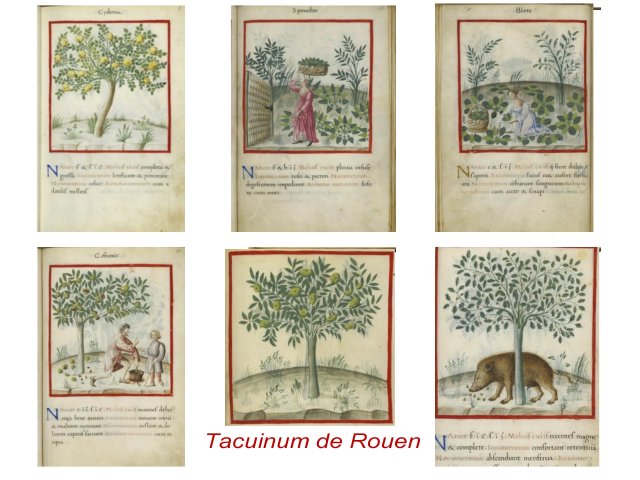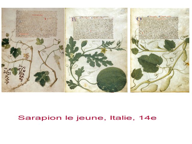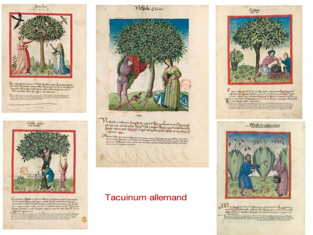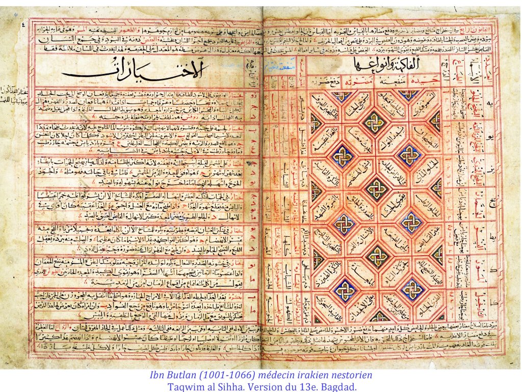 Voici un chapitre consacré aux traductions des 13 et 14e siècle essentiellement du TAQWIM al SIHHA, conçu au 11e siècle à Bagdad, par le sage Ibn Butlan. Vraisemblablement chrétien irakien. Essentiellement composé à partir des traités d’Hippocrate ( 460-371 av. jc) et des théorie des 4 éléments et des humeurs ( bile, sang, lymphe, noire) ainsi que des 4 notions de froid/chaud/sec/ humide combinées aux 4 saisons selon Gallien médecin et philosophe grec. Nicandre de Colophon sage et médecin gréco-turc du 5e siècle servira aussi de référence, tout comme bien sûr Dioscoride, qui pendant des siècles reste la référence des herbiers. Ecrits en grec, traduits en arabe, puis retraduits en latin et plus tard en langues régionales ( Allemand, toscan, anglais..) ces versions témoignent d’une pensée quasiment autonome, légèremet en marge des religions et correspondant à des invariants humains autour le la santé et du corps.