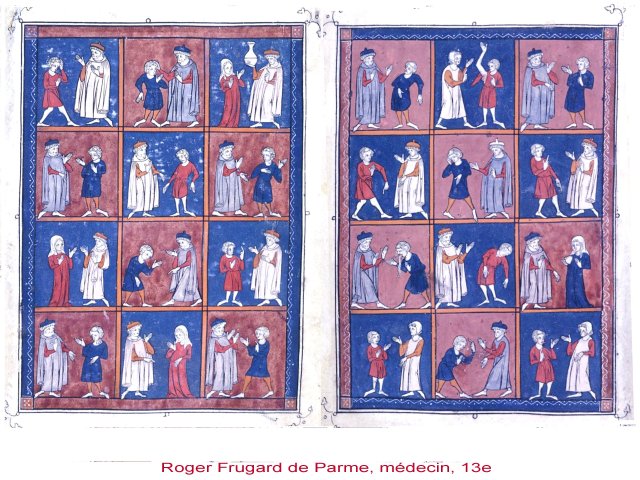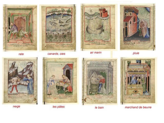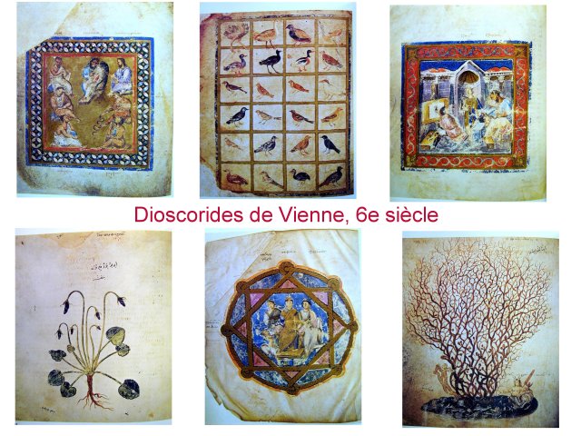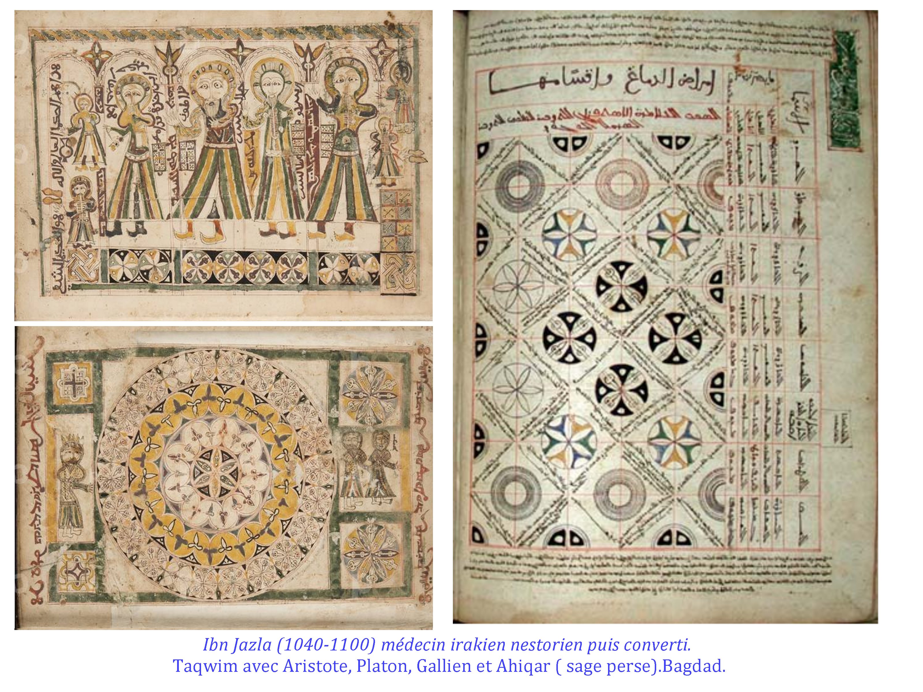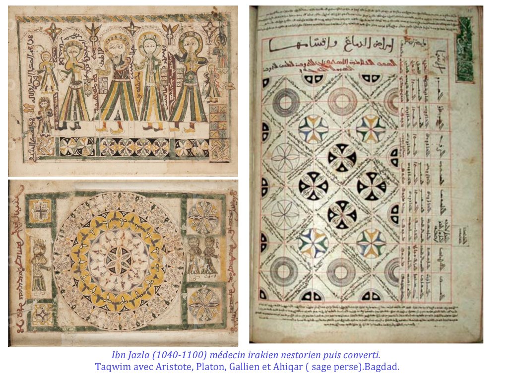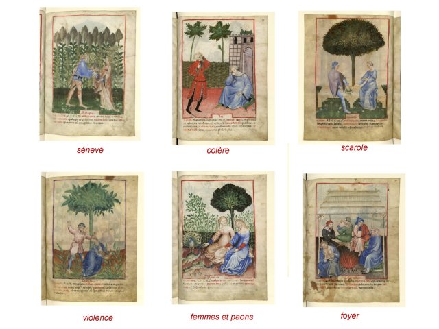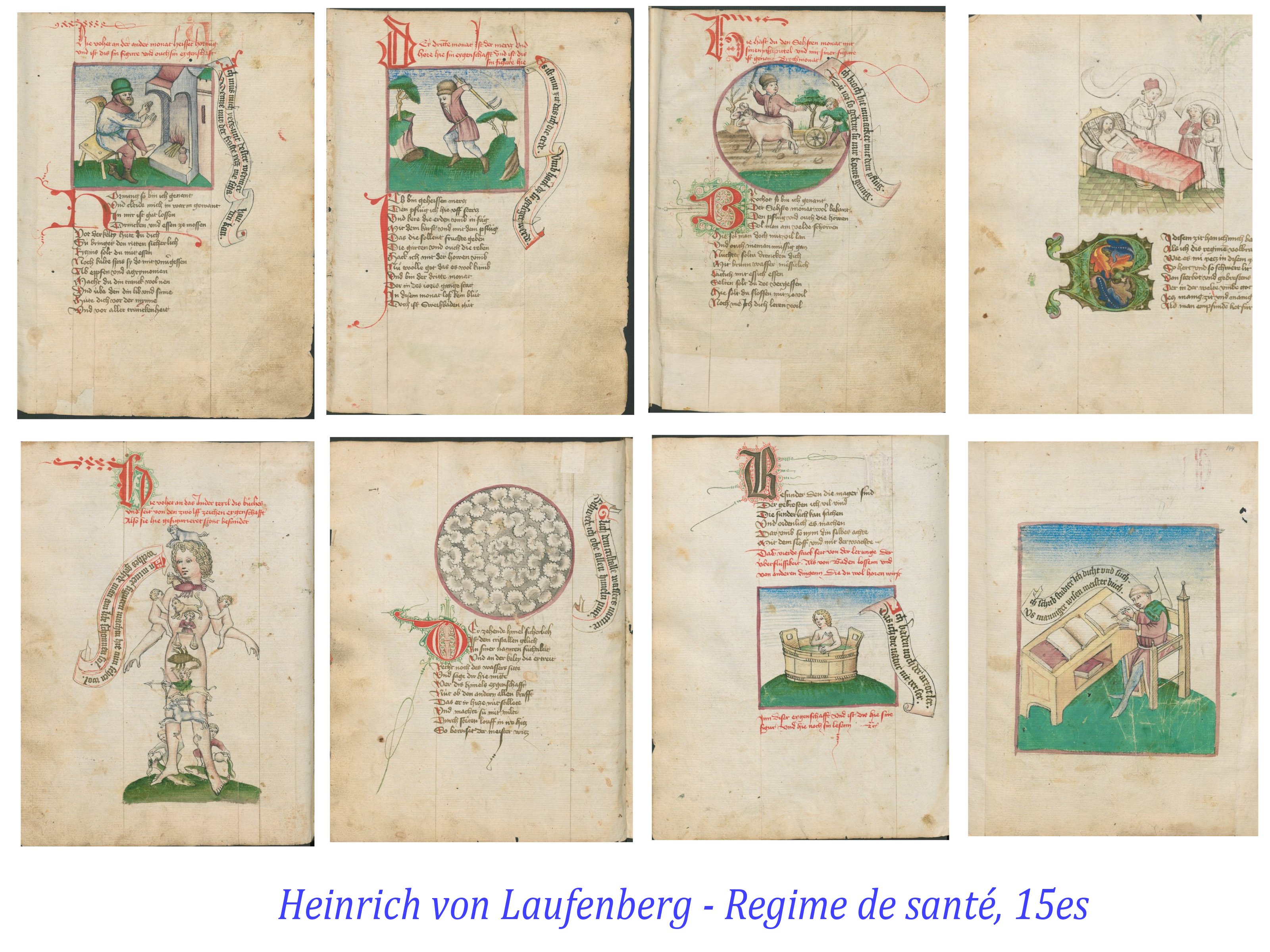 Voici un chapitre consacré aux traductions des 13 et 14e siècle essentiellement du TAQWIM al SIHHA, conçu au 11e siècle à Bagdad, par le sage Ibn Butlan. Vraisemblablement chrétien irakien. Essentiellement composé à partir des traités d’Hippocrate ( 460-371 av. jc) et des théorie des 4 éléments et des humeurs ( bile, sang, lymphe, noire) ainsi que des 4 notions de froid/chaud/sec/ humide combinées aux 4 saisons selon Gallien médecin et philosophe grec. Nicandre de Colophon sage et médecin gréco-turc du 5e siècle servira aussi de référence, tout comme bien sûr Dioscoride, qui pendant des siècles reste la référence des herbiers. Ecrits en grec, traduits en arabe, puis retraduits en latin et plus tard en langues régionales ( Allemand, toscan, anglais..) ces versions témoignent d’une pensée quasiment autonome, légèremet en marge des religions et correspondant à des invariants humains autour le la santé et du corps.
