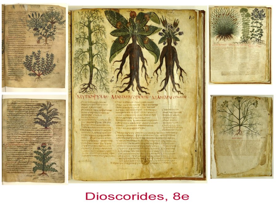 Très tôt les « dioscorides », herbiers peints, ici en grec, sont remarquable par la représentation mimétique des plantes.