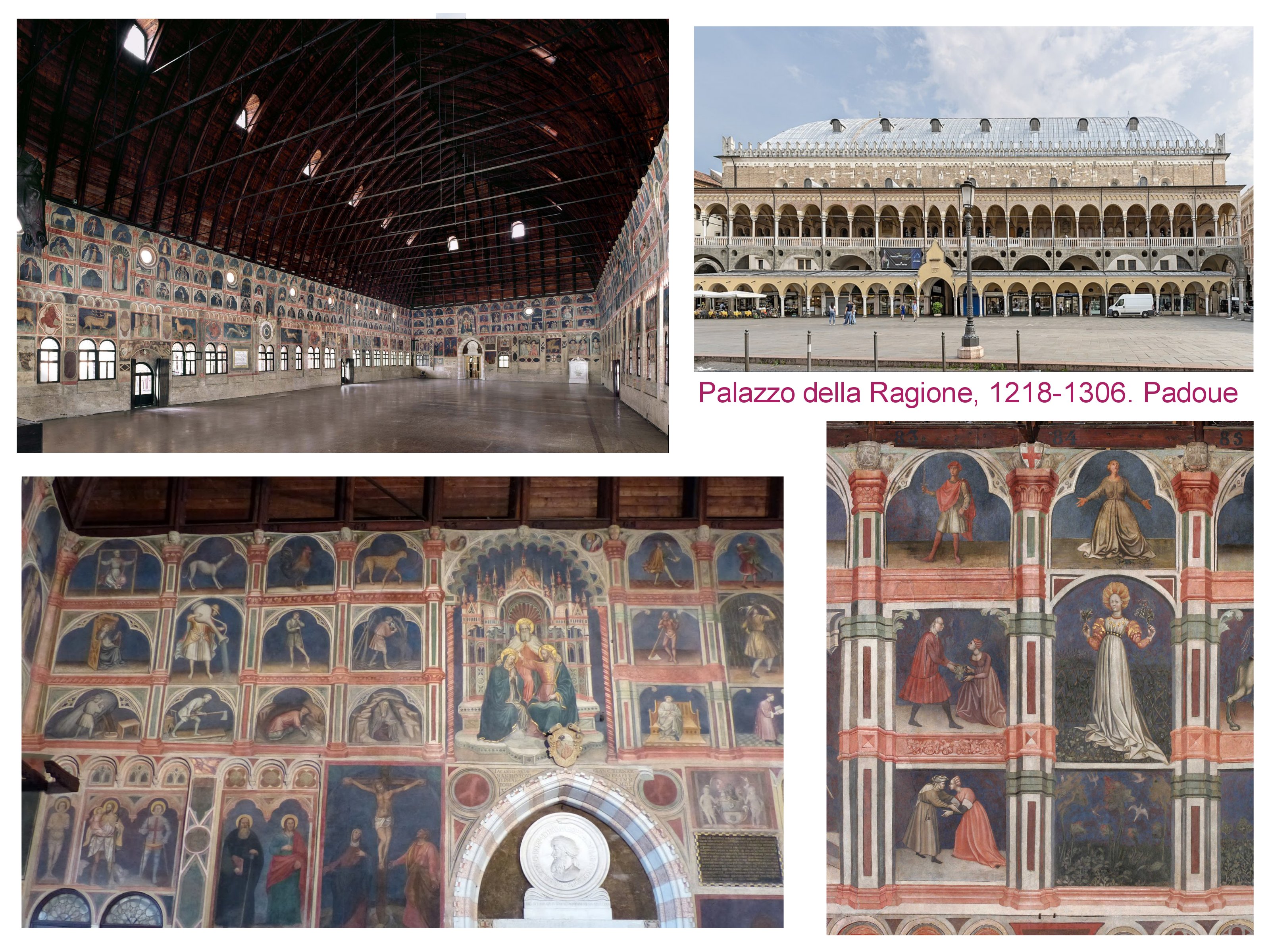 les magnifiques grandes halles « palis de la raison » de Padoue, Mantoue et Vicence parexemple, démontrent assez la force des pouvoirs temporels et l’insription de savoir vibre au coeur de la cité. On retrouve la aussi les figures proches des « tacuinum ». Idée d’équilibre et de société harmonieuse, entre genres, entre humains et toutes créations. Calendrier, almanach, vertus, zodiaque. Ces palais de la raison sont comme une continuation des « basiliques » préchrétiennes,halle, agora et temple.
