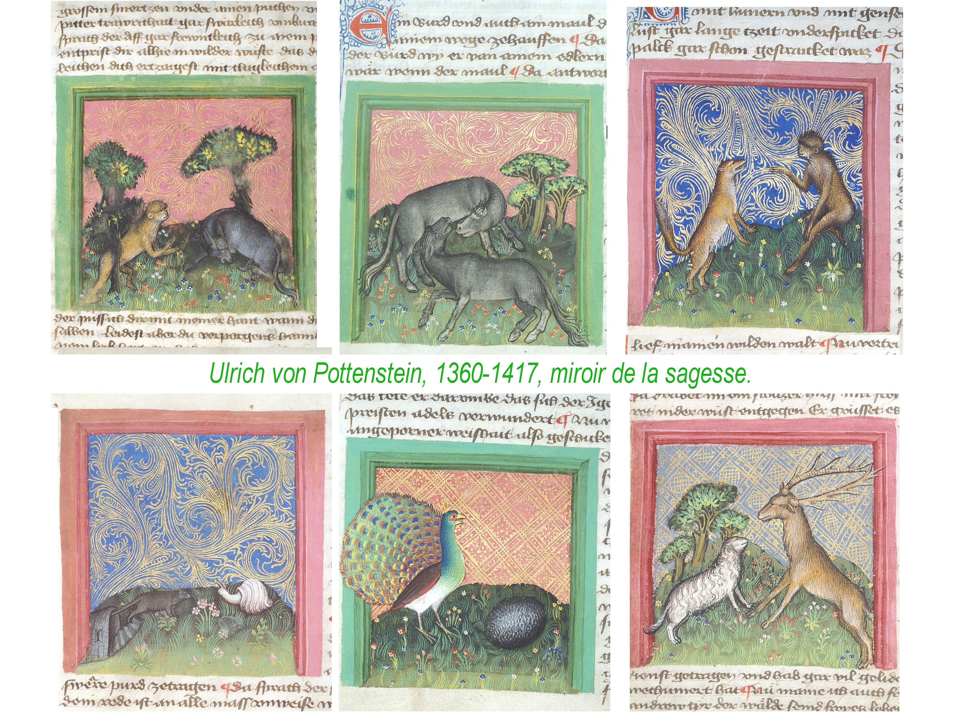 Les fables, inspirées d’ Esope, sont entre le bestiare et les « psychomachie » en vogue au moyen-âge ; traités de sagesse et de morale.