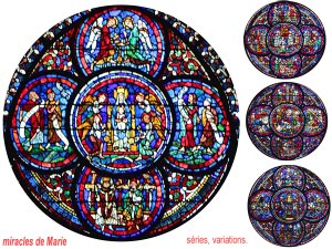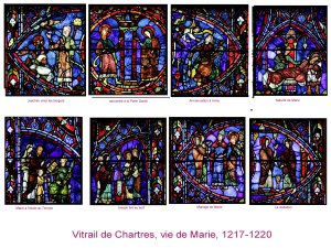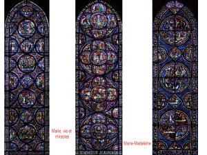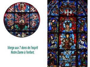 On retrouve Notre Dame en de nombreux vitraux. Le culte Marial, relativement récent se substitue presque au culte christique. Les traditions patriarcales caricaturales de la Bible sont écartées au bénéfice de la résurgence d’un culte très ancien de maternité ( voir isis/Horus) ainsi que de la fertilité des terres. les cathédrales dominent dans des régions de grande fertilité ( grand bassin parisien). les motifs de bourgeons et de floraison sont omniprésents.