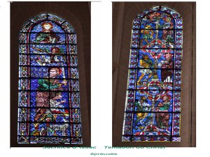 Les verrières hautes, très hautes reprennent de façon affirmée des scènes concentrées et non plus délayées dans la narration. Ici Le sacrifice d’ Isaac. leur gansd éloignement des yeux modère l’importance de la figuration ( relativisée dans les verrières basses par le fragmentation et les etites tailles).