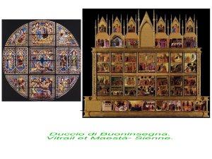 En Italie la pratique du vitrail est moins populaire ; l’art gothique est associé aux cultures nordiques et aux structures religieuses trop éloignées de la papauté, en écho des guerres entre Guelfes et Gibelins. La MAestà de Duccio est une version peinte des programmes iconographiques que l’on retrouve dan sles vitraux.