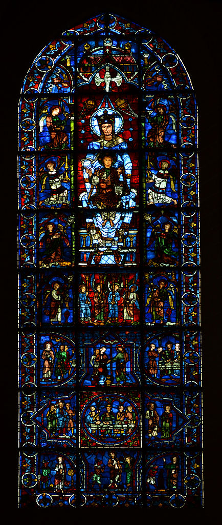 Il y a un passage progressif, par le linéament noir, généré par le contrejour, des structures de pierre, aux cadres de métal, puis aux contours des figures jusqu’au sertissage de plomb. Un aller et retour le la grande géométrie au chaos des fragments, en passant par les figures identifiables. Ici la figure majeure de Notre Dame.