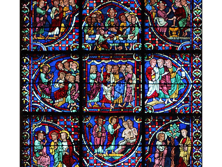 On repère là les structures métalliques carrées, qui permettent de construire un fragment de vitrail, au sol, puis de monter ( et démonter éventuellement le vitrail) dans sa structure de pierre.