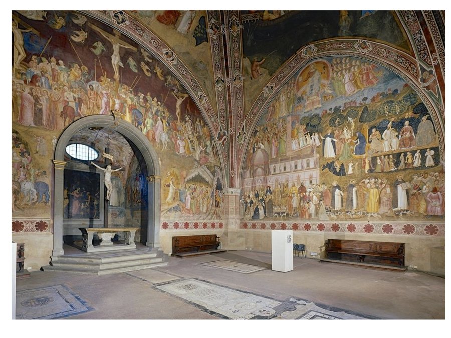 Cohérence des tons et du style d’ Andrea Buonaiuto, dit Andrea da Firenze. La grande différence de cet ensemble de fresques et de celles exécutées dans les églises, est qu’elle s’adresse aux moines essentiellement et qu’elle constitue un programme théologique.