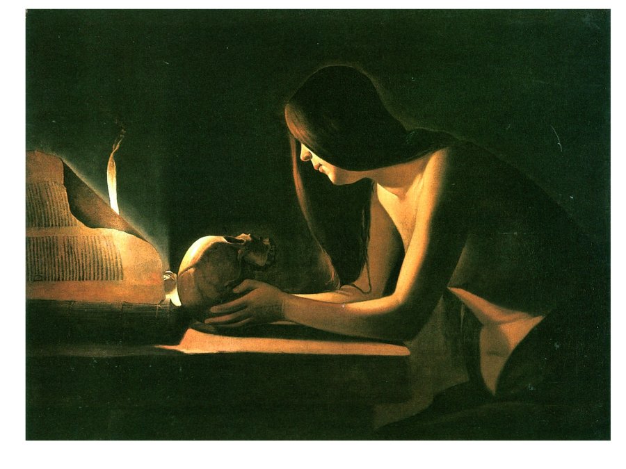 Madeleine encore, voilée par des cheveux défaits, sans atours, dans une nudité de cire et des poses passives, laisse brûler en elle le feu de la vie corporelle, atendant et désirant le dépouillement absolu de toute parure, à savoir, la mort, le squelette. De La Tour, répond ainsi aux critiques des Réformés, en proposant des peintures qui non seulement ne cherchent pas à séduire, mais déconstruisent toute séduction. Il n’y a rien à voir en cemonde..Dieu est irreprésentable.