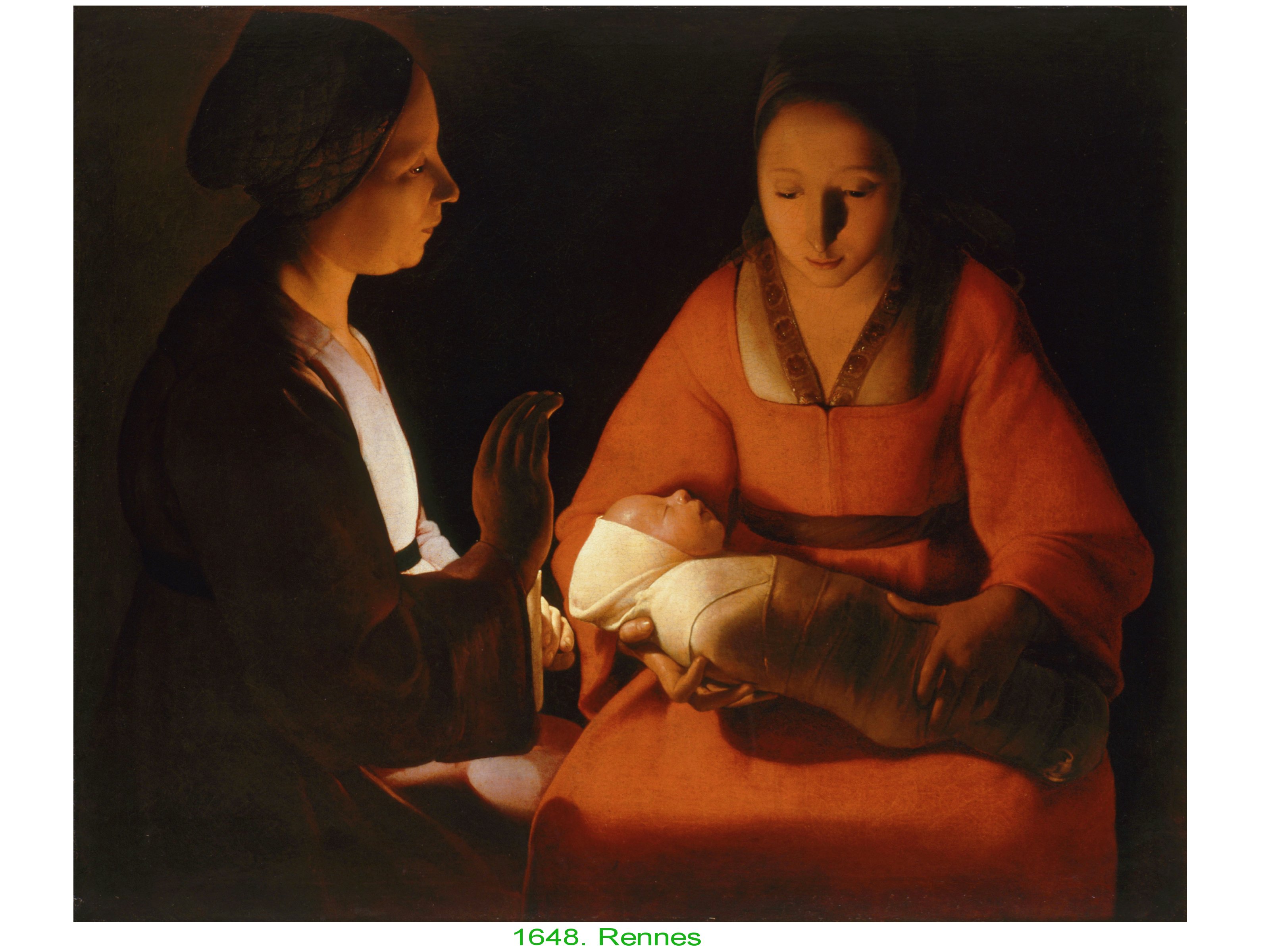 Les critiques des réformés portent aussi sur la prolifération des sujets et des saints catholiques. Les recommandations plus strictes, suggèrent de limiter les cultes aux saint proches de la personne de Jésus, aux premiers apôtres et disciples.Le Concile de TRente, qui s’étire sur plusieurs années, est comme obligé de répondre sur le fond aux remarques des réformés. Il semble assez clair, que De La Tour, intègre ces remarques et propose des scènes compatibles à ces reproches. Jésus est encore ici, montré impuissant mais source de lumière éphémère dans l’obscurité infinie. Marie semble maladroite et figée devany cette charge qui la dépasse. la puissance ne vient pas des actes.