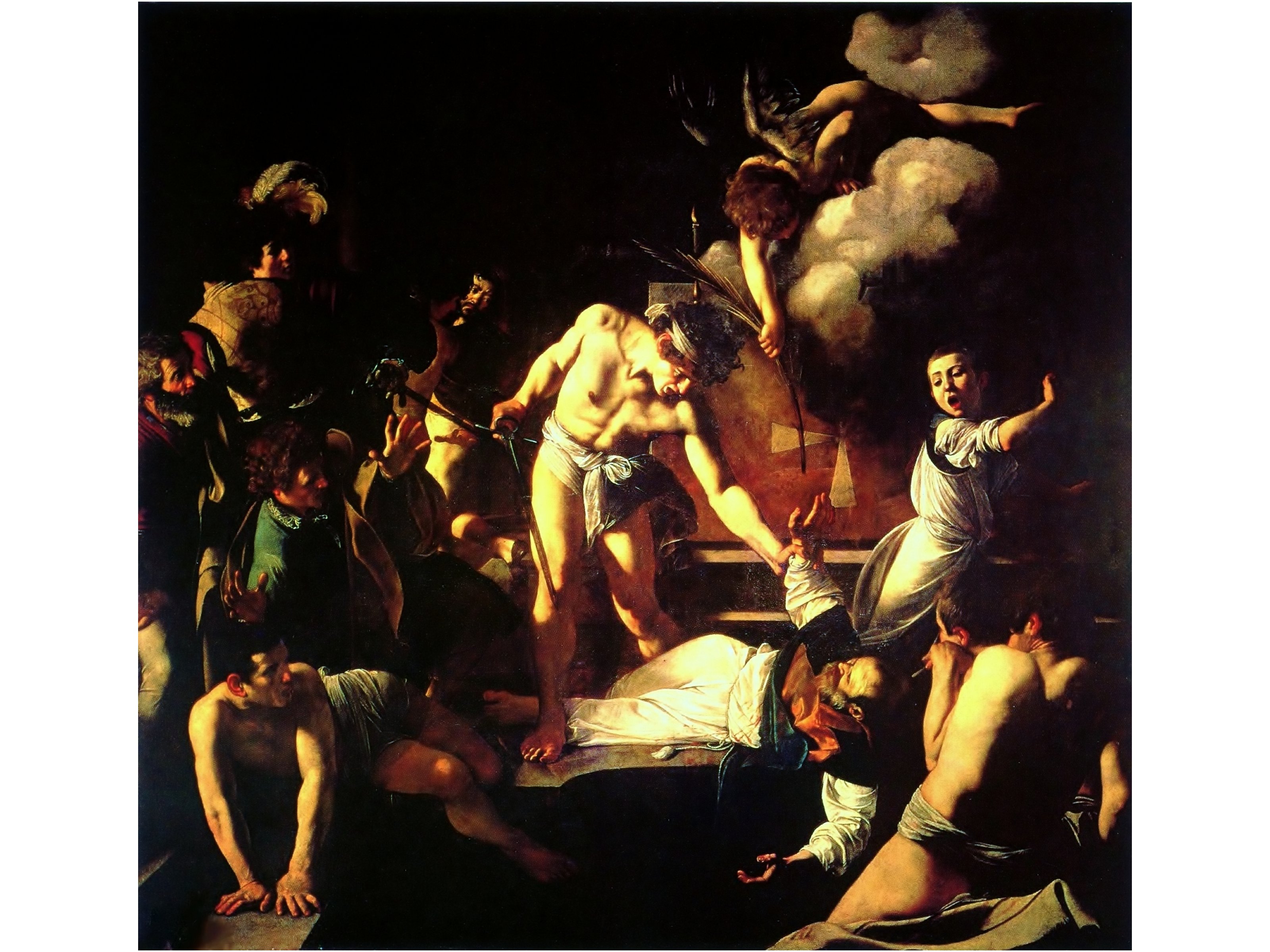 Caravage est aussi un metteur en scène prodigieux. Tout se passe au premier plan, dans des instants brefs où la vérité semble surgir, saillir du fond. Les figures sont comme projetées dans notre espace, au lieu que dans les genres artistiques précédents, les spectateurs étaient invités à « rentrer » dans les espaces suggérés par les perspectives et paysages. Le martyr de St Matthieu est l’une des plus complexes compositions. La lâcheté des témoins est partagée pas le peintre, qui se serait, dit-on représenté dans l’un des fuyards de gauche.