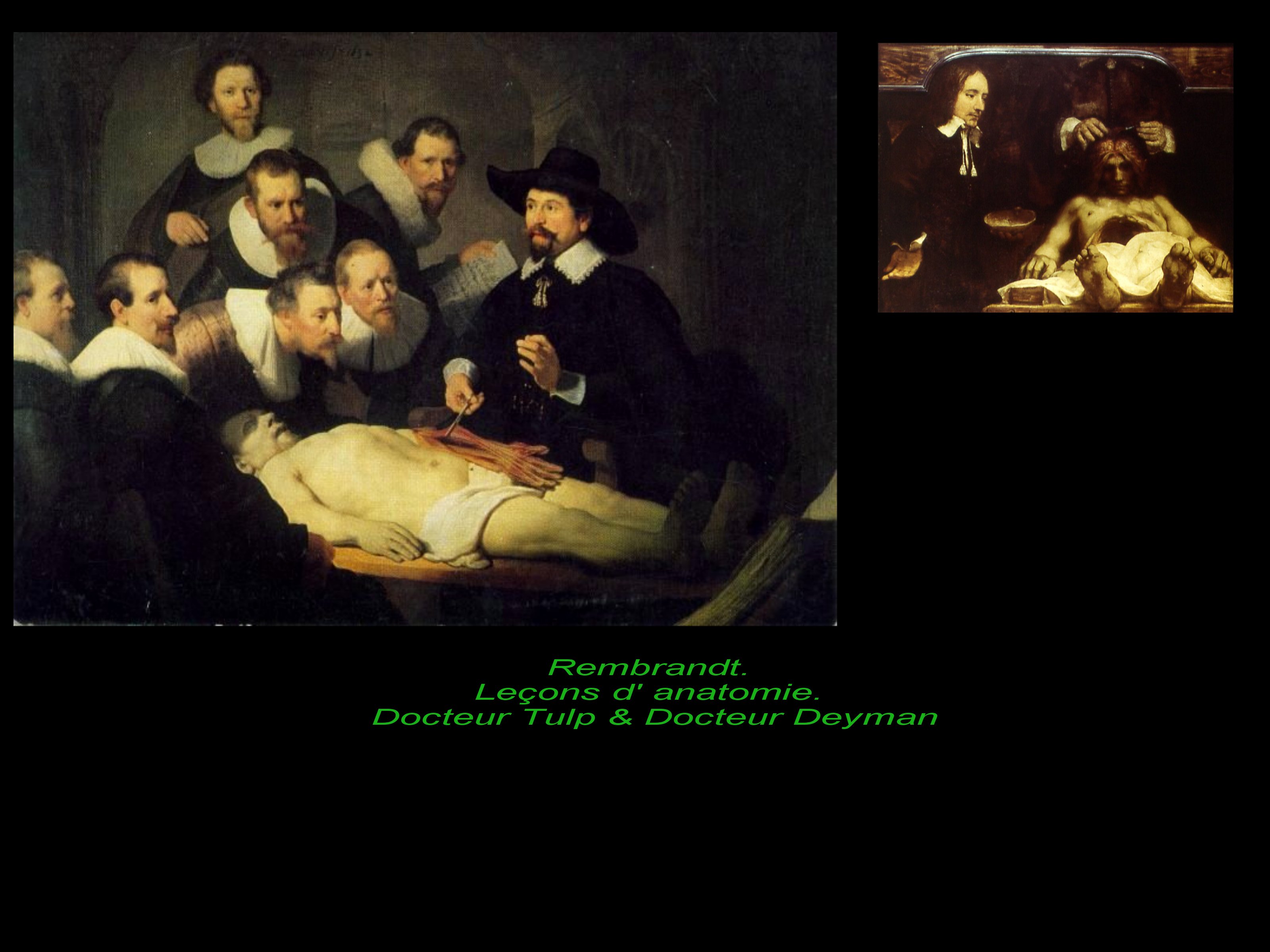 La leçon d’anatomie du Dctr Tulp est comme une confirmation de la valeur cardinale de l’expérience associée à l’esprit et à la lumière. Ici, le chirurgien, le peintre et le voleur ( Adrian-Adrienz, voelur exécuté), sont tous 3 virtuoses de l’association du regard et de la main. Tulp désigne clairement les tendons et nerfs, qui conduisent de la main au cerveau. Les assistants, ne regardentr d’ailleurs pas vraiment la démonstration, certains regardent ailleurs et d’autres se penchent vers le livre. Ils ne sont pas acteurs de leur savoir. La démonstration est encore plus nette dans la lecçon d’anatomie du Docteur Deyman..La main tient ici franchement la calotte crânienne et les mains du chirurgien s’apprêtent à manipuler la matière cervicale. Le corps est comme un cgrist rendu à l’atat de chair morte dont il faut extraire la matière subtile, a pensée. Iconoclaste discret, Rembrandt ne met en scène ni néant, ni infini, mais des situations concrètes qui suffisent au vertige de la pensée.
