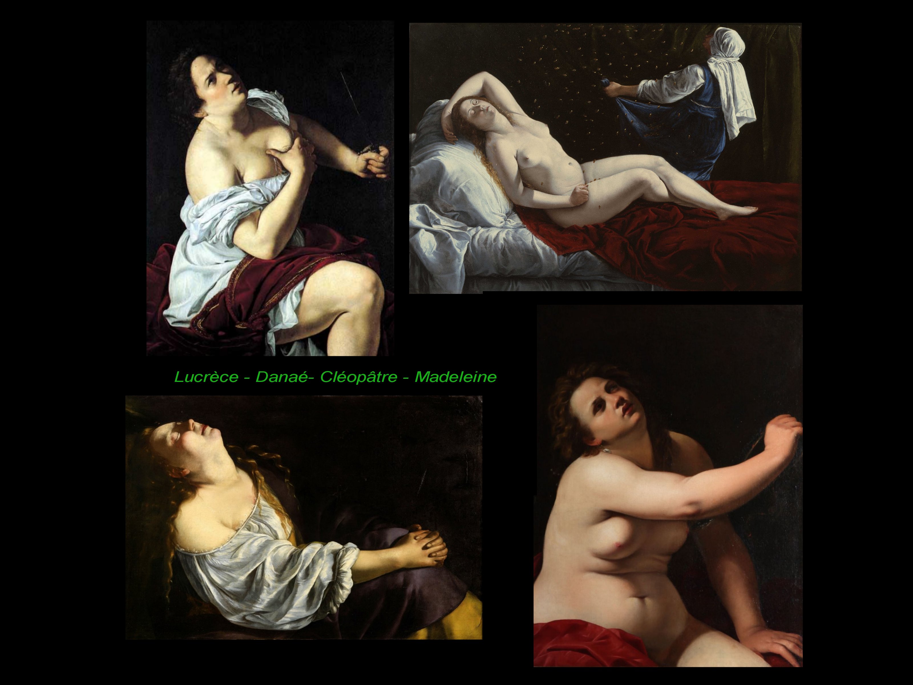 Cléopâtre, Danaé..autant de figures féminines abusées et/trompées,mais encore Marie-Madeleine..La question d’une certaine malédiction de la séduction pour une femme, qui en finit victime. Grentlleschi traite aussi plusieurs scènes de Suzanne et les vieillards, ainsi que Bethsabée au bain..Autant de mythes , toujours présentés du point de vue masculin et ici revus par Artemisia qui présente ces jeunes femmes dérangées et espionnées dans leur intimité.