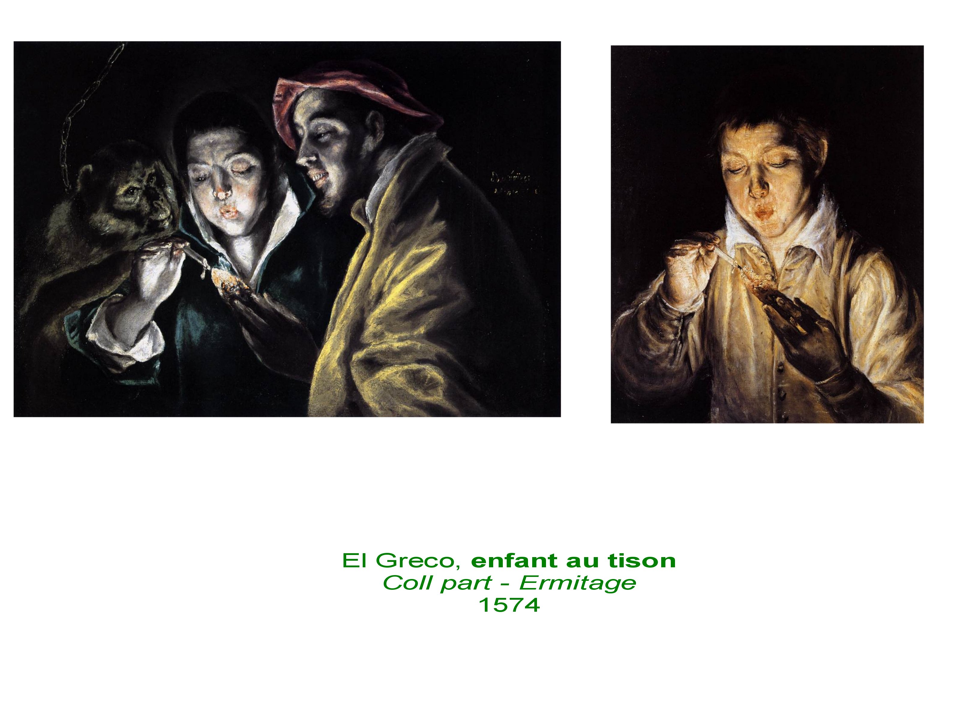 Un autre peintre singulier use aussi des forts contrastes lumineux ; il s’agit de Greco ( Domenikos Théotokopoulos). Crétois passé par Vanise ( Titien) et Rome, il est accueilli par la cour exaltée du roi Philippe 2. La passion irrationnelle et la fougue éloignée de la mesure issue de la Renaissance italienne, convient à l’esprit de la « reconquista ».On remarque que dans ces deux peintures, Greco associe, comme De La Tour, l’enfance aux brandons, aux braises, comme une lumière ardente, naissante, mais éphémère.