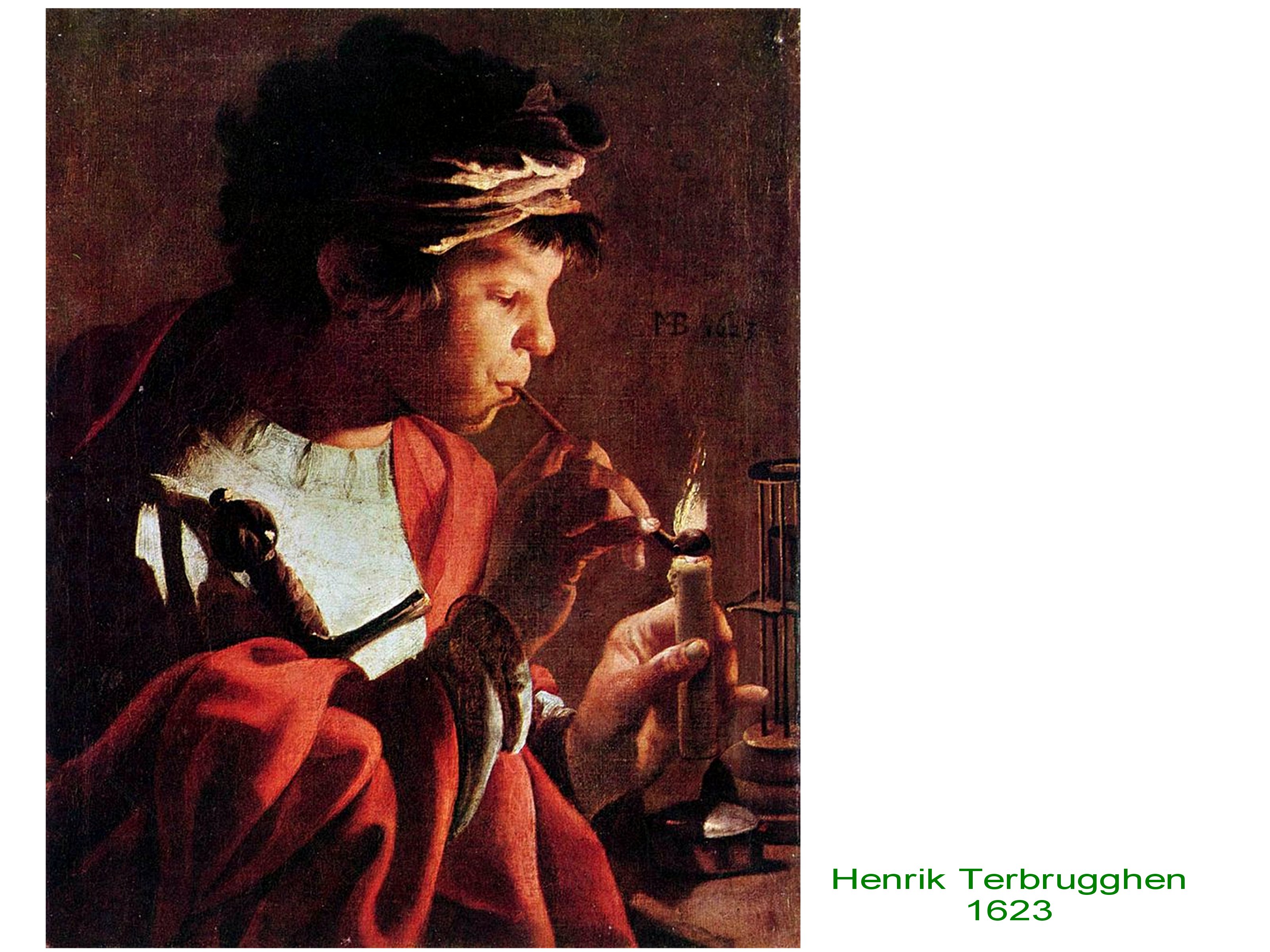 Il est très vraisemblable que De La Tour ait été initié aux compositions de clair-obscur par ses contemporains et voisins de l’ Ecole d’ Utrecht ayant voyagé en Italie et ayant rencontré et admiré les oeuvres de Caravage et aussi de Gentilleschi ( le père dans un premier temps). Ainsi on retrouve encore chez Terbrugghen, le motif du jeune homme soufflant sur une braise. Les coloris évoquant le corps et la chair également développés par de La Tour sont explorés par Terbugghen.