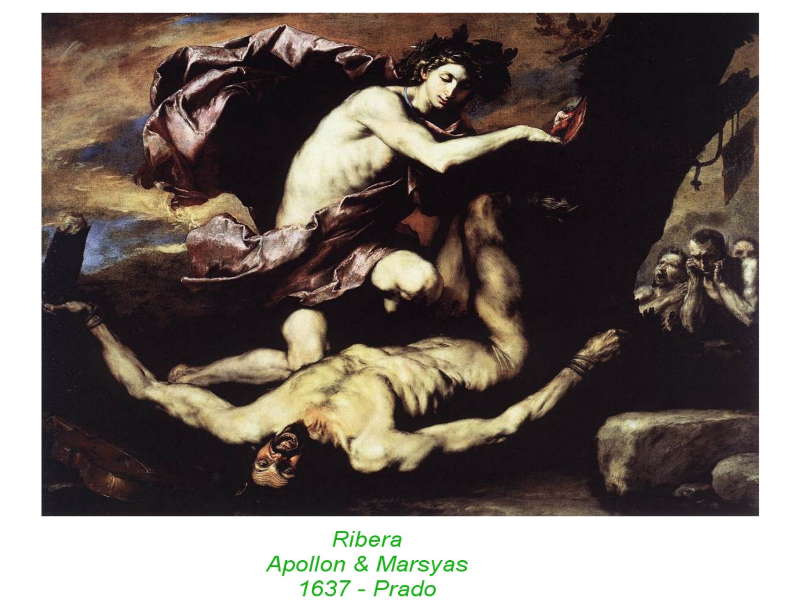 En Espagne,loin de Greco, l’étranger mystique, se constitue un petit groupe d’artistes cultivés et soucieux d’explorer des enjeux esthétiques et philopsophiques. le combar entre Apollon et Marsyas, est l’un des mythes les plus significatifs de ces questionneents. beauté apolinienne, de la distance, de l’intelligence et de la spiritualité solaire ou beaité triviale et populaire de Dyonisos et des satyres, triviale, sexuelle et terrestre. ici symbolisée par l’opposition de la flûte ( instrument à vent, du corps, issu du viol par Pan de la Nymphe transformée en roseaux) et du luth à corde d’ Apollon, instrument digne et solaire. Mydas ayant préféré Marsyas, est affublé d’oreilles d’ ânes et Marsyas écorché vif par le cruel et dominant Apollon. Opposition radicale entre réalisme et idéalisme.