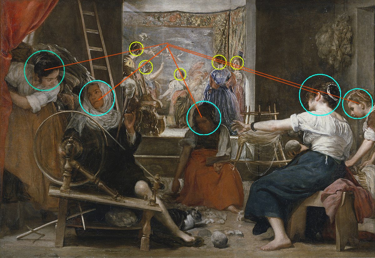 Ce shéma explicite de façon claire les liens qui existent pourtant entre ces deux univers. Liés par la perspective, il y a corrélation et projection du premier plan vers le lointain et/ou inversement, du monde réel, tangible, humain, populaire, travailleur, vers le monde divin, aristocrate, solaire et idéalisé. Il faut savoir que Vélasquez, comme tout peintre, est proche par son travail des artisans et travailleurs manuels, mais il est aussi un intellectuel travaillant et fréquaentant l’aristocratie, en tant que peintre de cour et ami proche du roi Philippe 4.