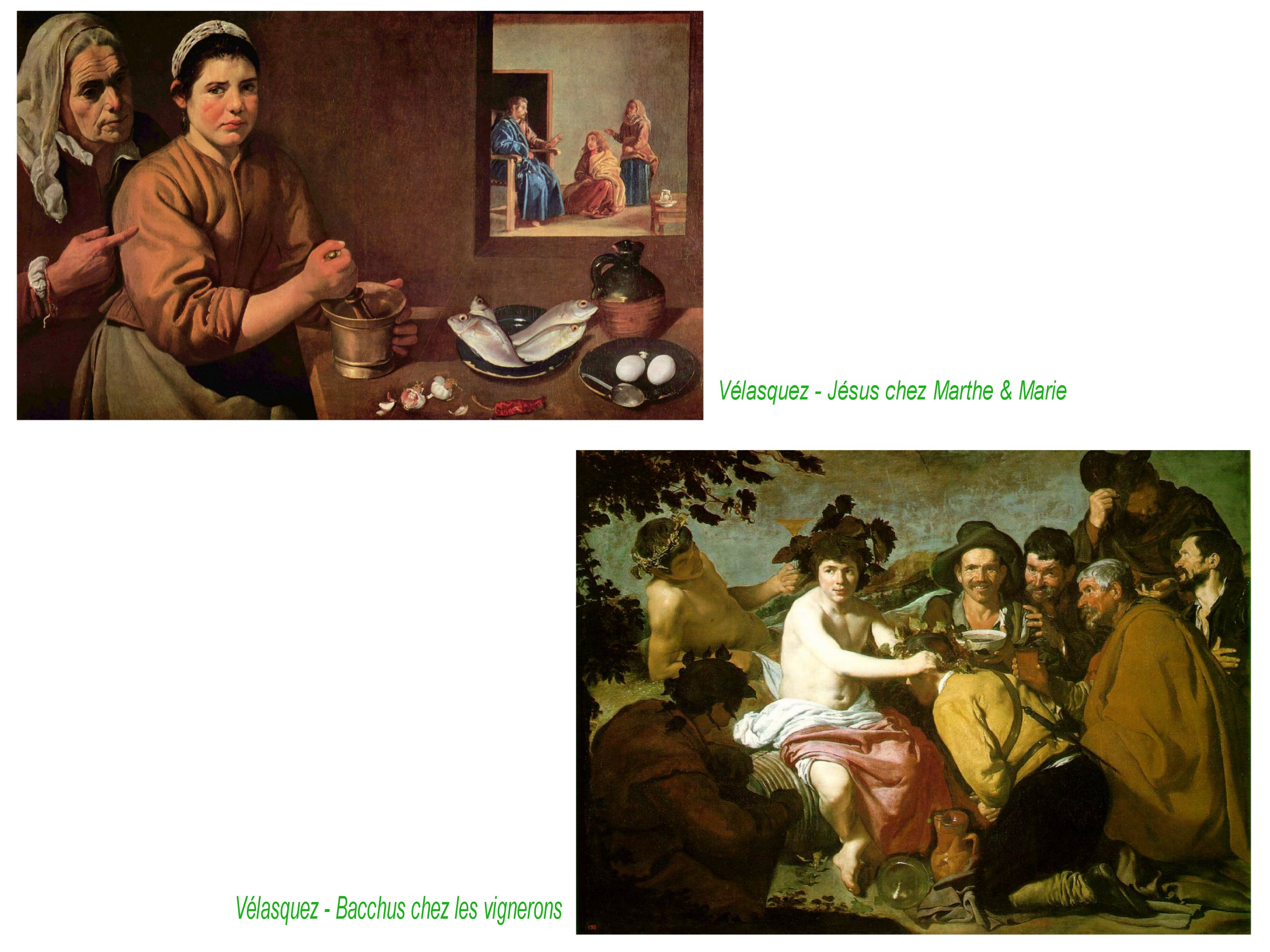 A l’évidence il établit des liens complexes entre les 2 mondes. Marthe, ici, comme travailleuse manuelle, pétrit les aliments ( symboles chrétiens cependant) ; elle a le physique d’une cuisinière du peuple, éclairée par une lumière rasante, comme le porteur d’eau. Elle est peinte de couleurs de terre, au premier plan, mélancolique et oubliée, ignorée, comme les fileuses..Mais pourtant, sa manière de recevoir Jésus est pour Vélasquez aussi digne que celle de Marie, qui écoute passive et colorée dans une lumière dorée leur sauveur. Dans un lieu improbable, miroir, fenêtre, tableau . Au centre, rien. Vélasquez expérimente une « diploptie », phénomène possible grâce aux « lunettes » et télescopes, qui permetent de voir simultanément des éléments proches et des des éléments lonntains, sans relations directe de l’un à l’autre. Bacchus chez les vignerons, établit de nouveai un rapport d’équilibre entre les 2 mondes, divins et humains. Les 2 récipients, de verre et de terre, rapellent les contenants présents dans le « porteur d’eau de Séville ». 2 limières, 2 mondes, 2 beautés possibles. réalisme et/ou idéalisme. Aristocrate et/ou populaire, Terrestre/céleste…Vélasquez ne se satisfait pas de la mélancolie des artistes baroques du clair-obscur, il cherche à établir des relations équilibrées.