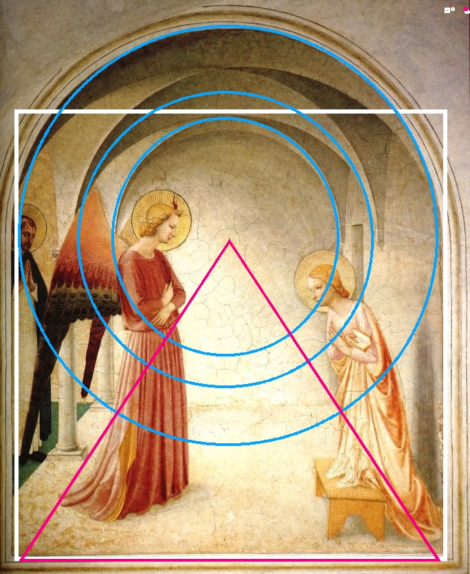 Ces annociations de Fra Angelico montrent une conscience claire de la place du point de fuite et de l’usage de la perspective. Procédé devenant symbolique. Métaphore de Jésus ordonnat la terre. Point de repère spatial, temporel et moral.
