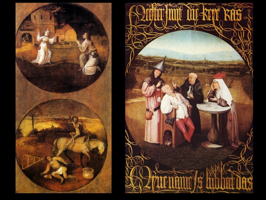Même dans de petites scènes de genre, Bosch introduit des dimensions métaphysiques et existentielles, comme l’excision de la pierre de folie!.