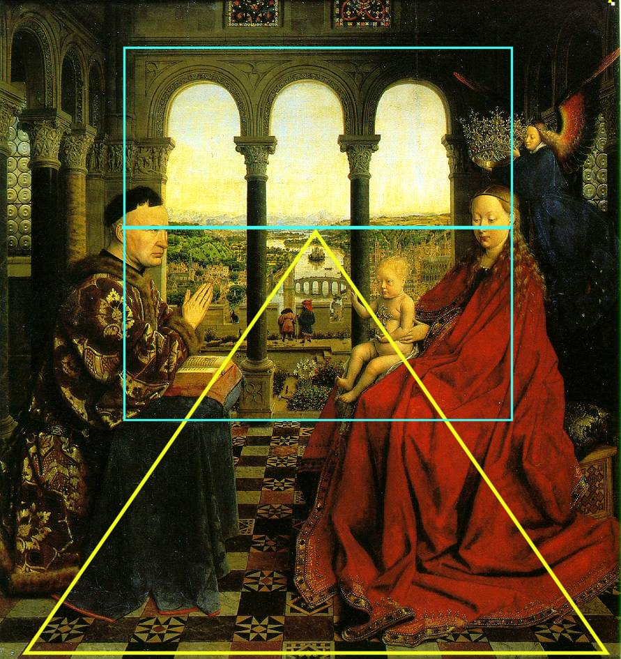 Le même Van Eyck, fait un usage d’une très grande subtilité, de l’horizon et du point de fuite, pour marquer une distance infinie entre l’humain et le divin. Notre regard vers le lointain croise le regard de Rolin vers Marie. Nous sommes un point infime, vus de l’horizon de même Rolin est invisible du point de vue de Marie. Comme l’horizon porte le point de fuite, Marie porte Jésus.