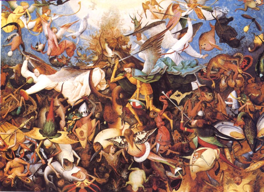 Le grand héritier direct, bien que né après la mort de Bosch, est certainement P? Breughel, qui reprend dans la chute des anges rebelles, l’idée presque « moniste », d’un bien et d’un mal consubstantiels, qu’il faut indéfiniment séparer sans passion, avec la froide détermination de l’ archange Michel. On voit la cohorte innombrable des anges rebelles, surgir de la lumière divine. Les couleurs terre, associées à la réalité des démons présentés frontalement et de façon saturée.